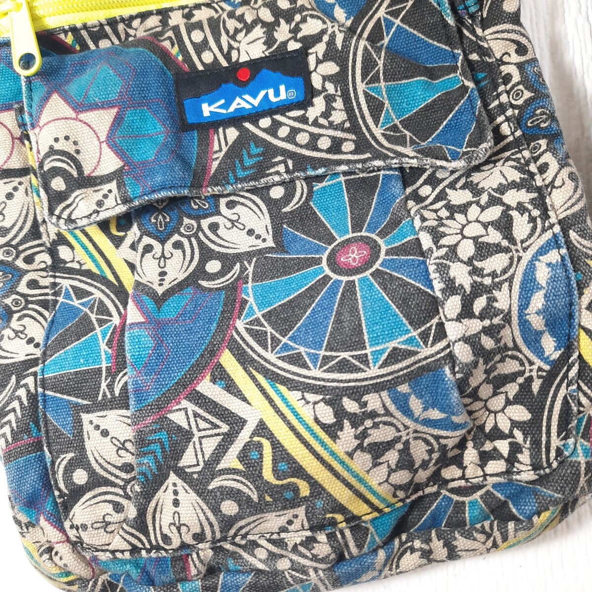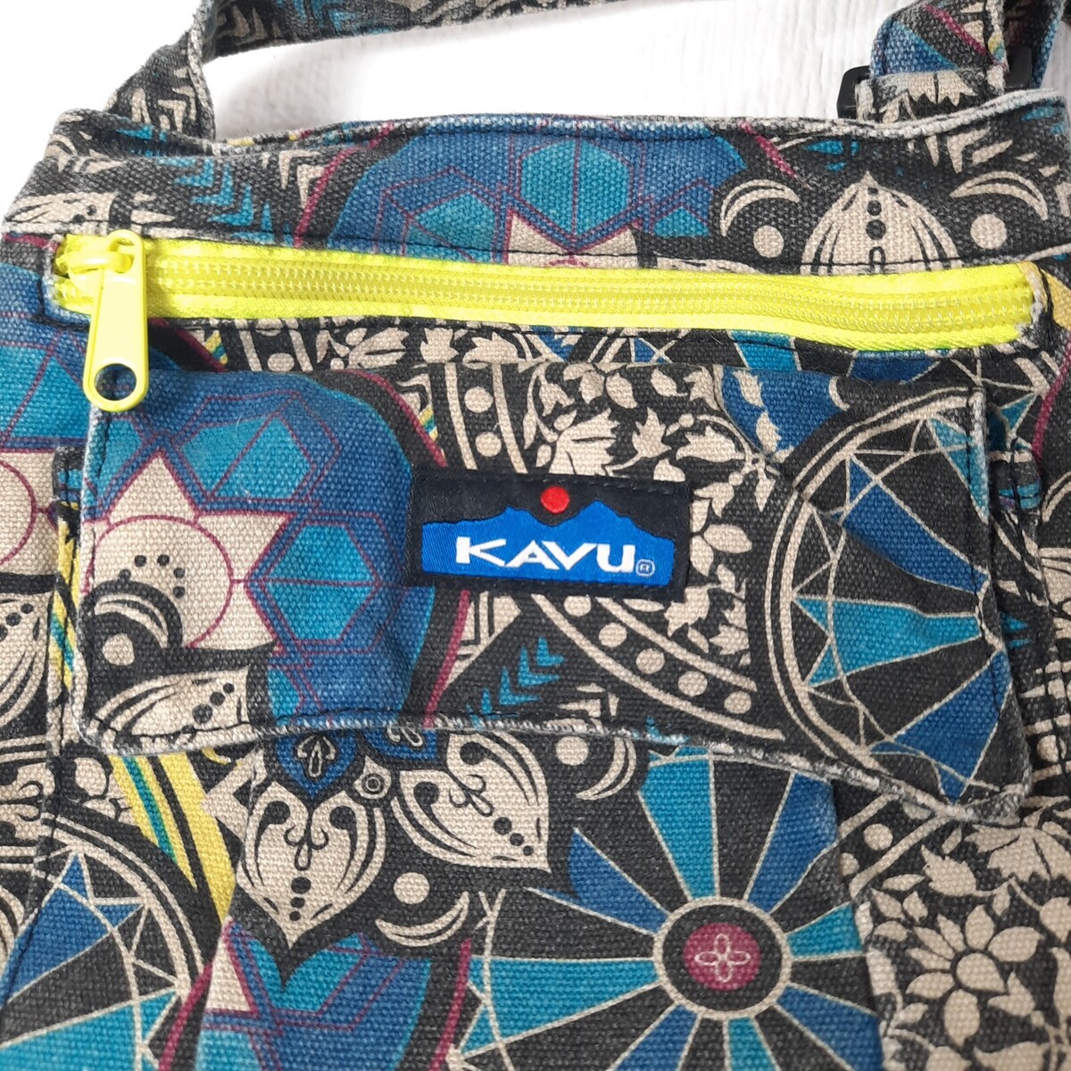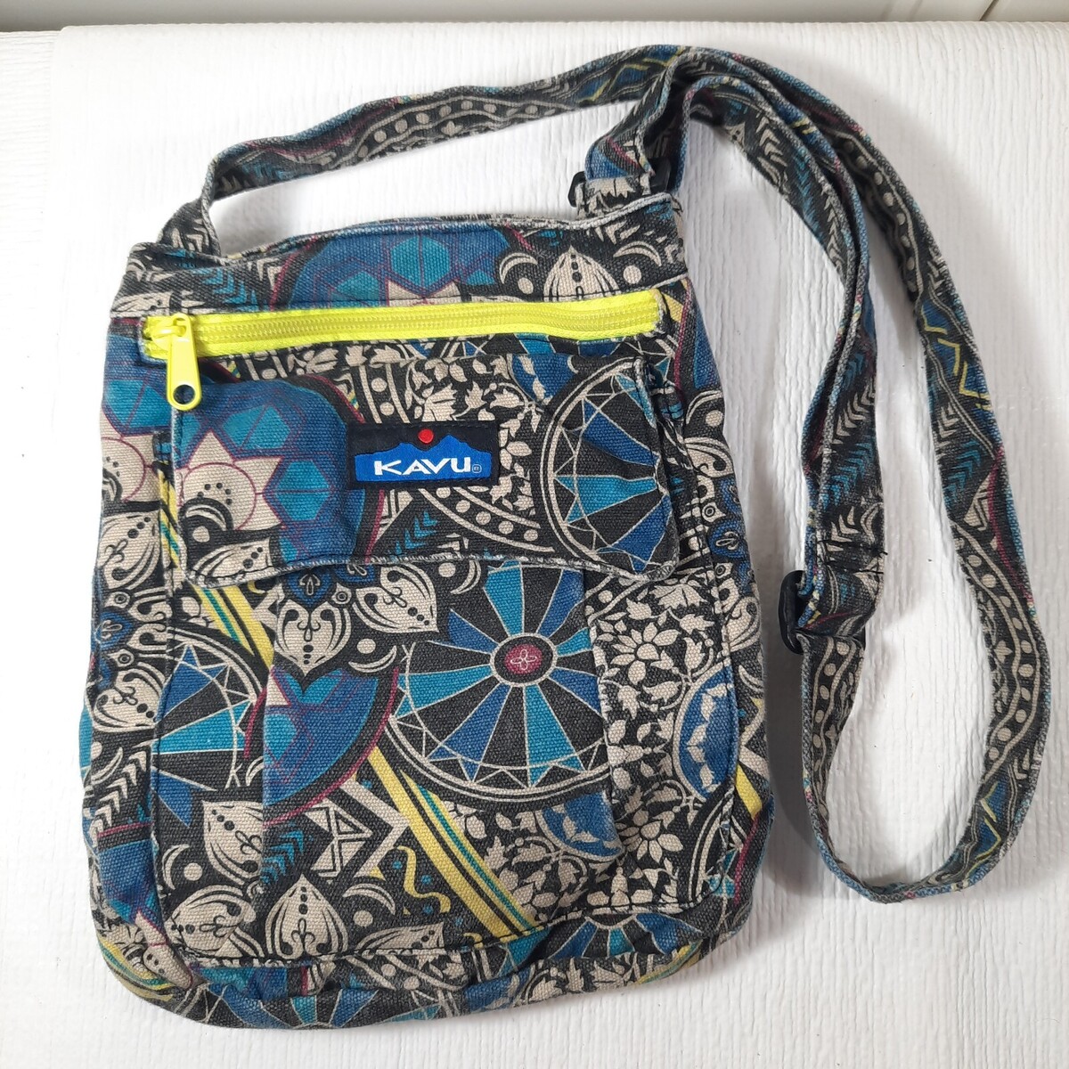 - Kavu Crossbody Keeper purse blue black medallion Adjustable Strap Canvas Bag
