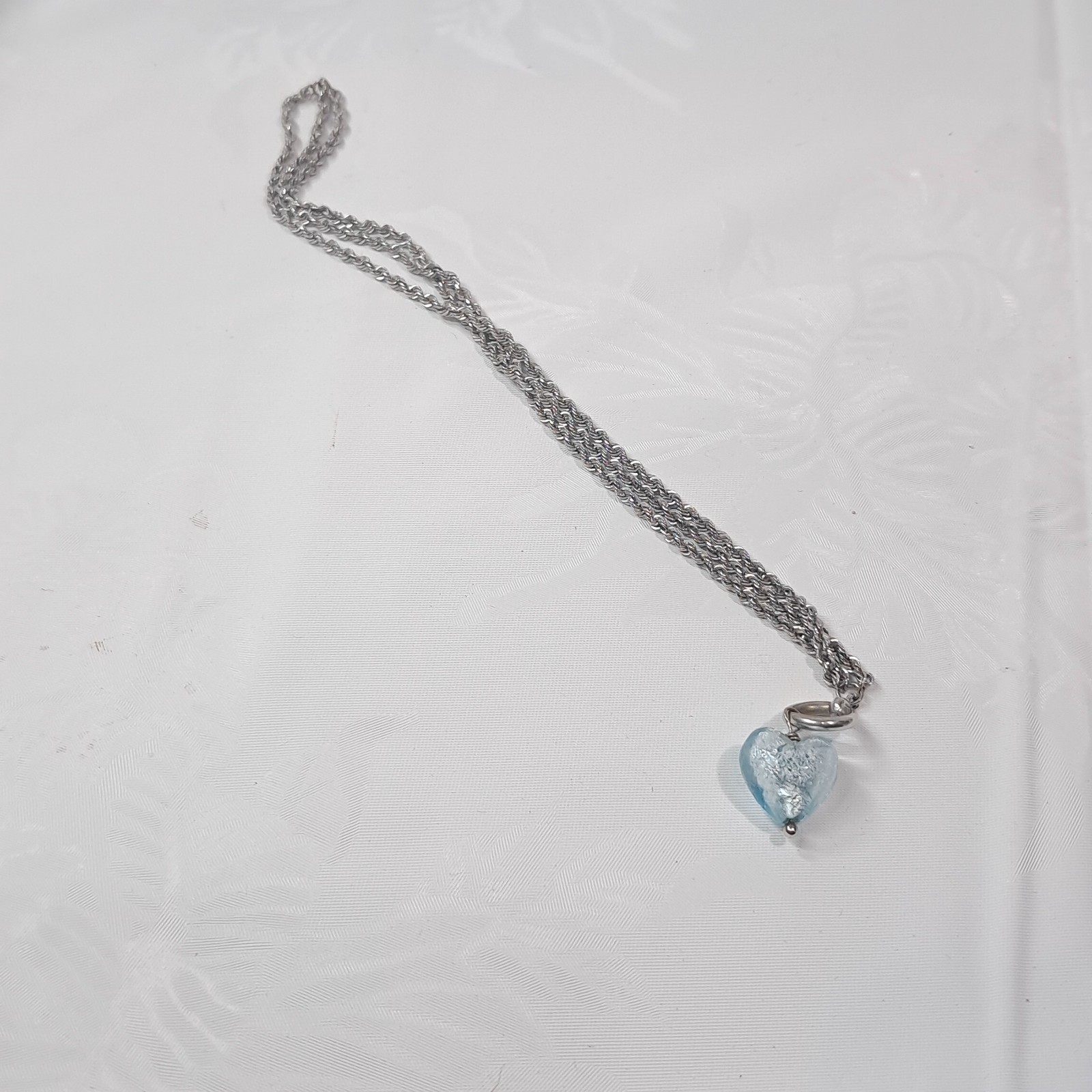 Light weight bracelet with venetian glass heart in light blue with silver swirls.