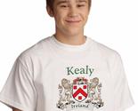 Product description: Kealy Irish Coat of Arms Tee Shirt in White. Every Irish family has a story to tell, probably hundreds of stories. Your Irish coat of arms is a visual record of your family's oldest, most significant stories. Here, they're told in bright, permanent artwork on these fine-quality, 100% cotton Gildan tee shirts. Over 25 years of heraldry research and over 1000 available Irish family coat of arms.
