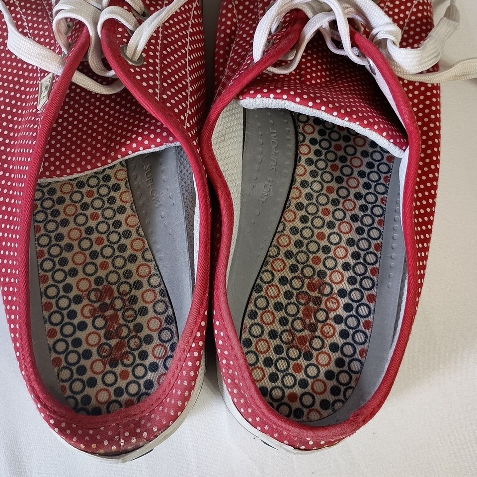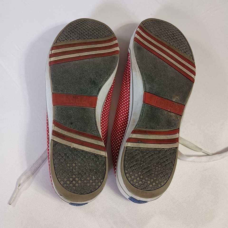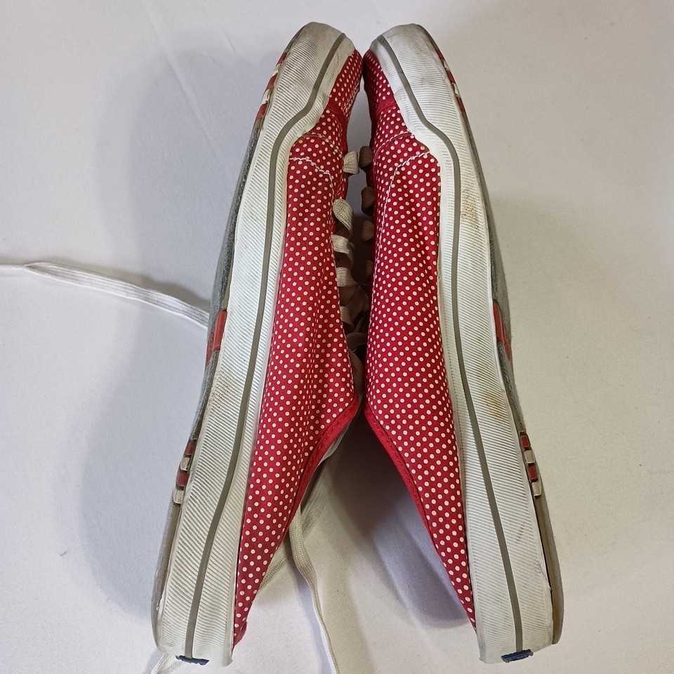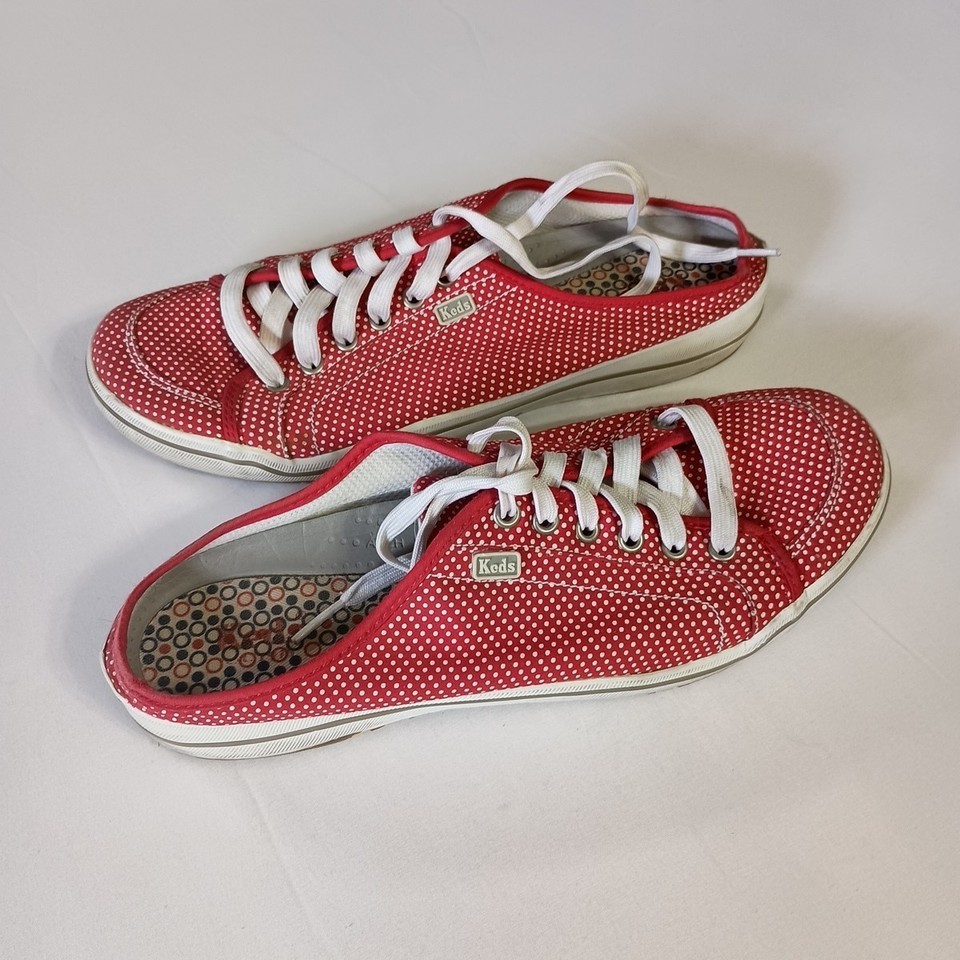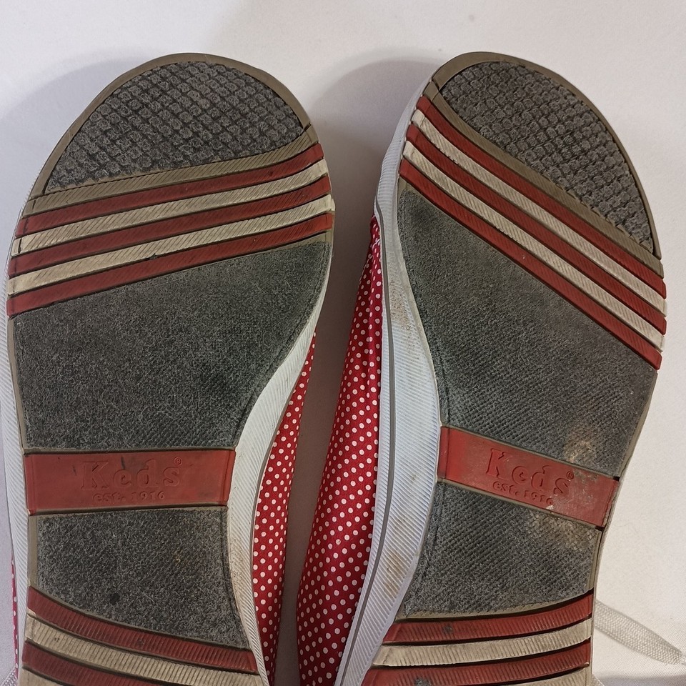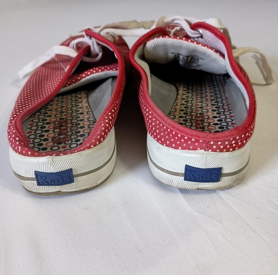 The product is a pair of Keds Women's Sneakers in size 9, featuring a slip-on style with a lace-up closure for a comfortable fit. The shoes are made of red canvas with white small polka dot accents, making them a cute and stylish choice for casual occasions or travel. With a low heel height and comfort features, these sneakers are perfect for outdoor activities and everyday wear. The brand, Keds, is known for its quality and timeless style, making these shoes a versatile addition to any woman's wardrobe. Normal wear.