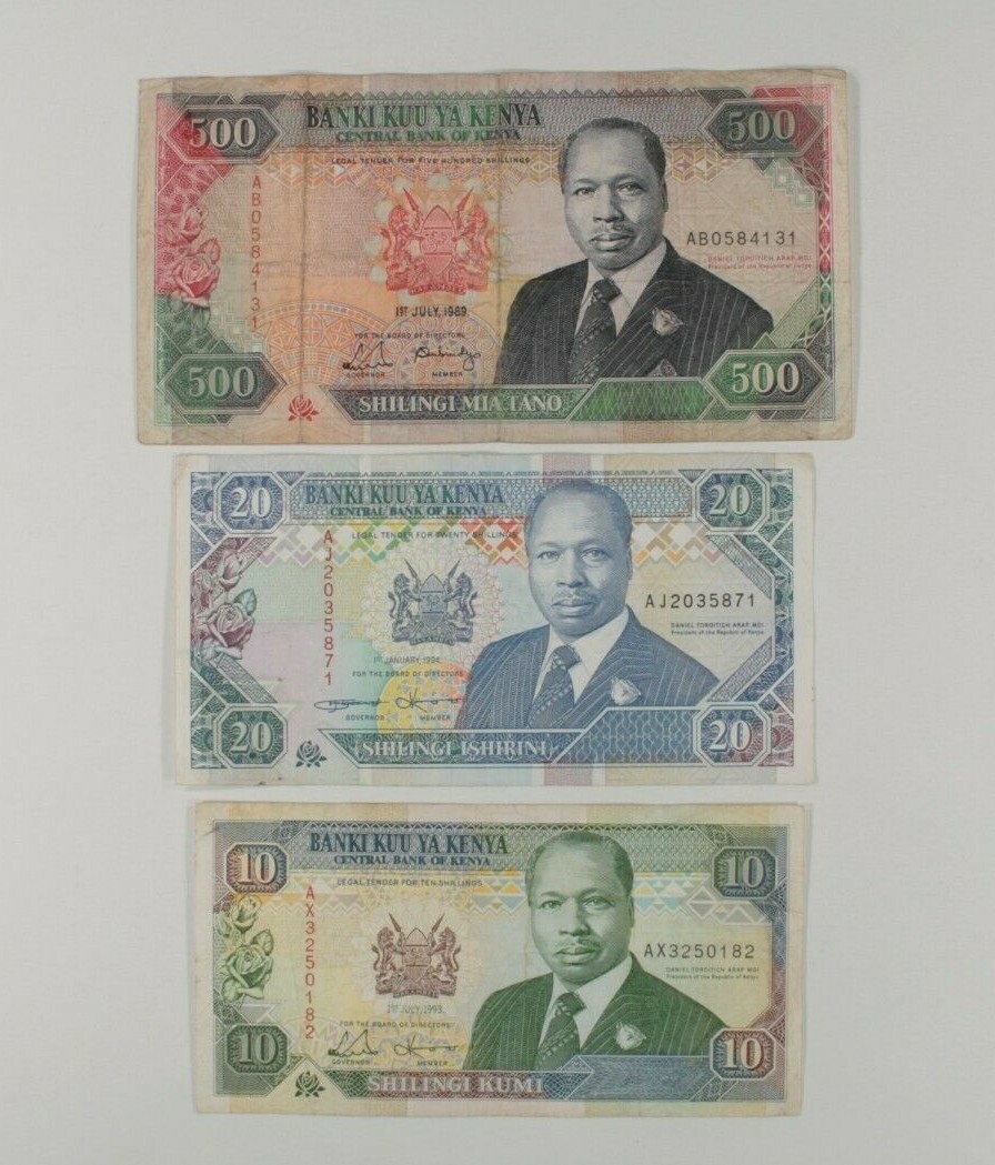 - Kenya 3-Notes Currency Kit 1989-1994 10, 20 & 500 Shilling