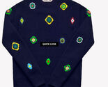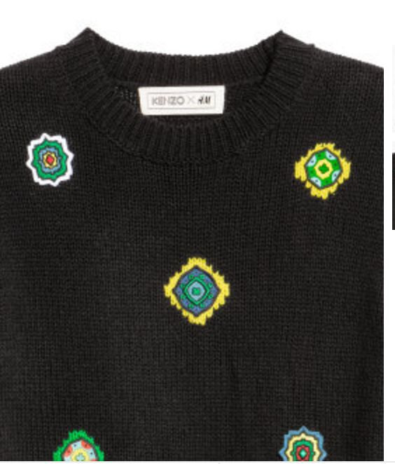 KENZO x H M. Knit sweater in wool with appliques front and back. Ribbing at neckline, cuffs, and hem. Appliques are partly embroidered and partly made of rubber. 100% wool. Hand wash cold .