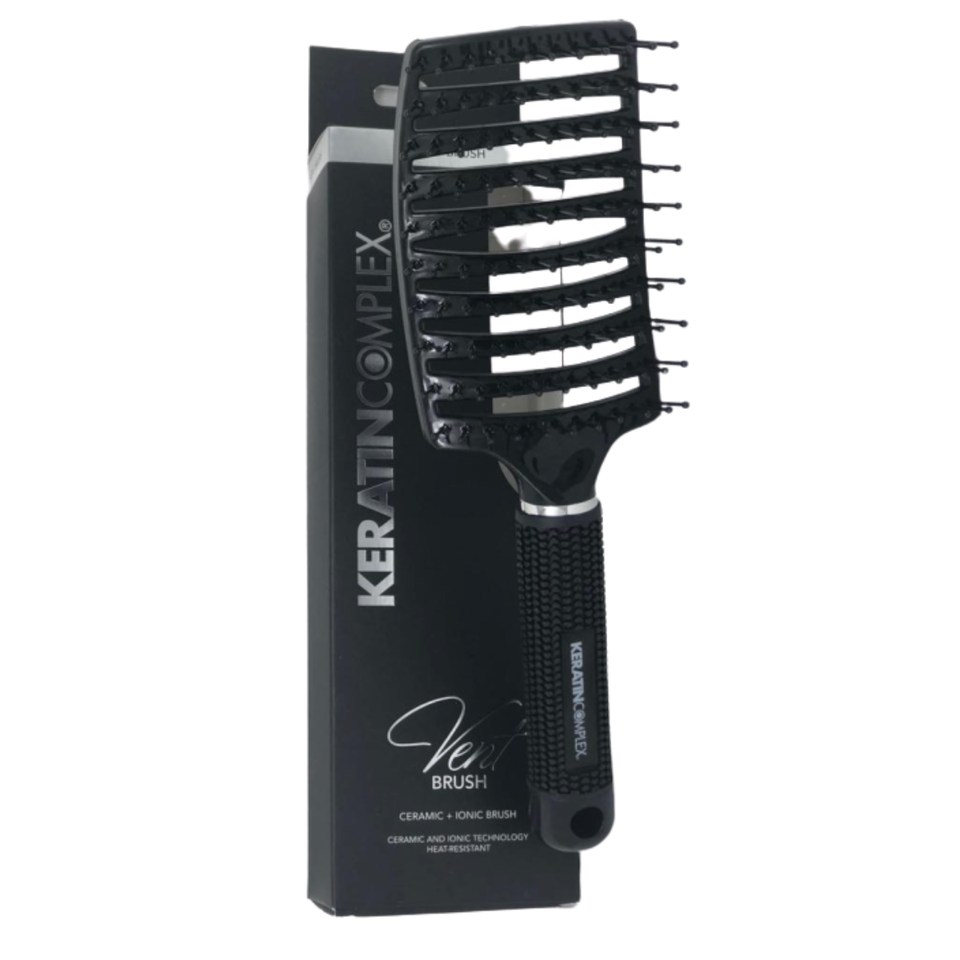 What is this product? Keratin Complex unique, curved Vent Brush was developed especially for Keratin Complex Smoothing Therapy. This innovative design allows more heat to flow to the hair shaft, reducing drying time. More info: Our Vent Brush provides for easier styling and comfort for both the stylist and the client Light Weight Design. Cushion Rubber Handle. Innovative Curve Design. Reduces Blow-Drying Time.