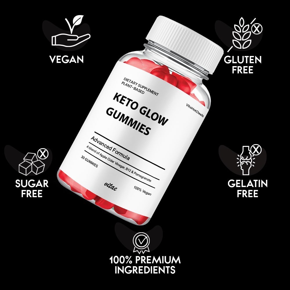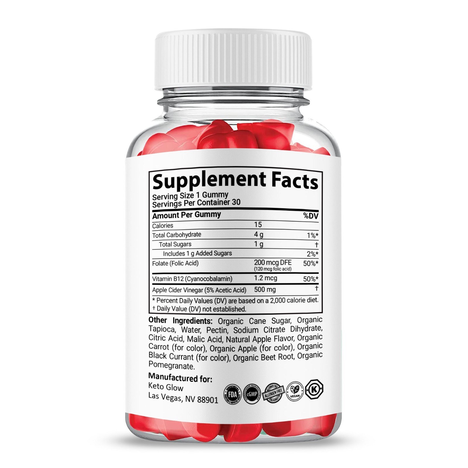 Keto Glow + ACV Gummies. These aren?t just gummies?they?re made with the good stuff like ACV, vitamin B12, pomegranate, and beet root, all packed into one tasty vegan bite. Zero gelatin, zero gluten, and absolutely no artificial colors or flavors. One gummy a day and enjoy a full 30-day supply of feel-good flavor.