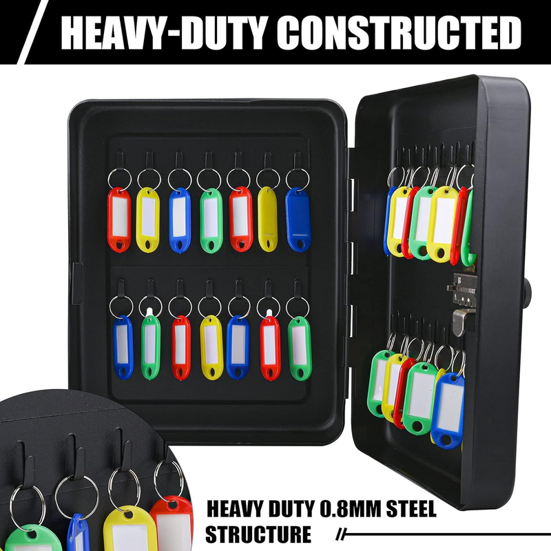 ?Up to 28 Keys?The storage key cabinet provides 28 hooks, and attched corresponding key tags. Key box can holds up to 28 keys. Mark key labels with both name and corresponding sticker numbers, hang them up in numerical order so that you could find them in one minute every time you need