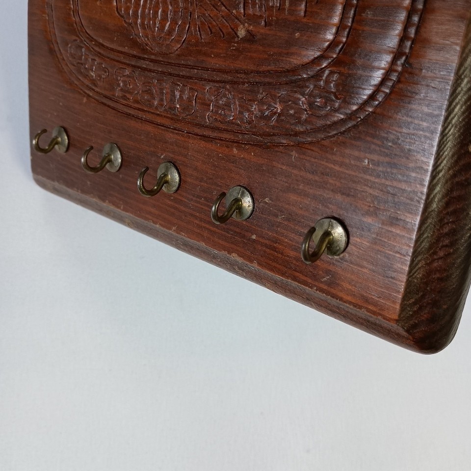 This Key Holder is a handcrafted, retro farmhouse piece adorned with the phrase "Give Us This Day Our Daily Bread." Made of brown wood with a square shape, it features 5 key hooks and a mid-century modern style. The item measures 7" in length and height and 8" in width, making it a practical and decorative addition to any home. It is designed for easy hanging and does not require any assembly. Normal wear. See pictures. Sizes are approximate.