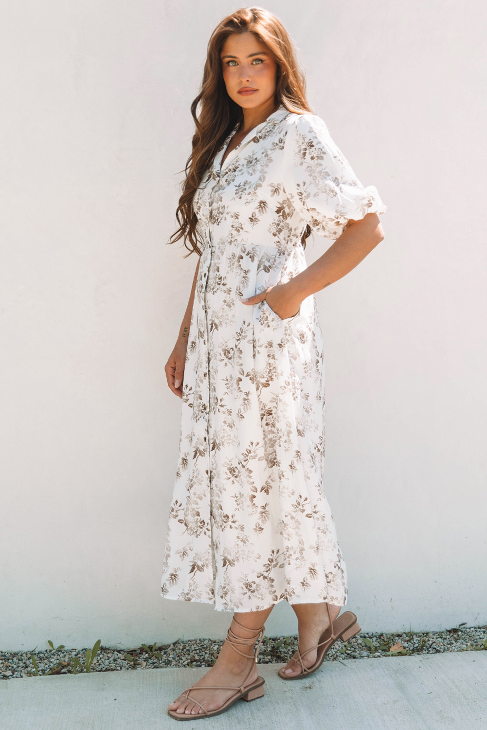 Primary image for Khaki Floral Puff Sleeve V Neck Buttoned Front Maxi Dress