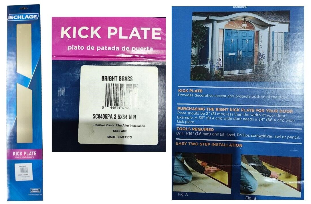 Protect your doors in style with the SCHLAGE SC8400PA3 6" x 34" Kick Plate, part of the premium IVES by Schlage collection designed to combine lasting durability with timeless elegance. Crafted from high-quality aluminum and finished in a lustrous Bright Brass tone, this kick plate provides reliable protection against scuffs, dents, and wear caused by foot traffic?making it ideal for both high-use interior and exterior doors in homes, offices, apartments, and commercial buildings.
