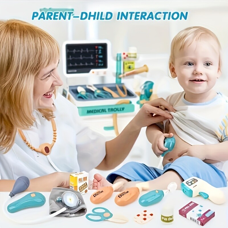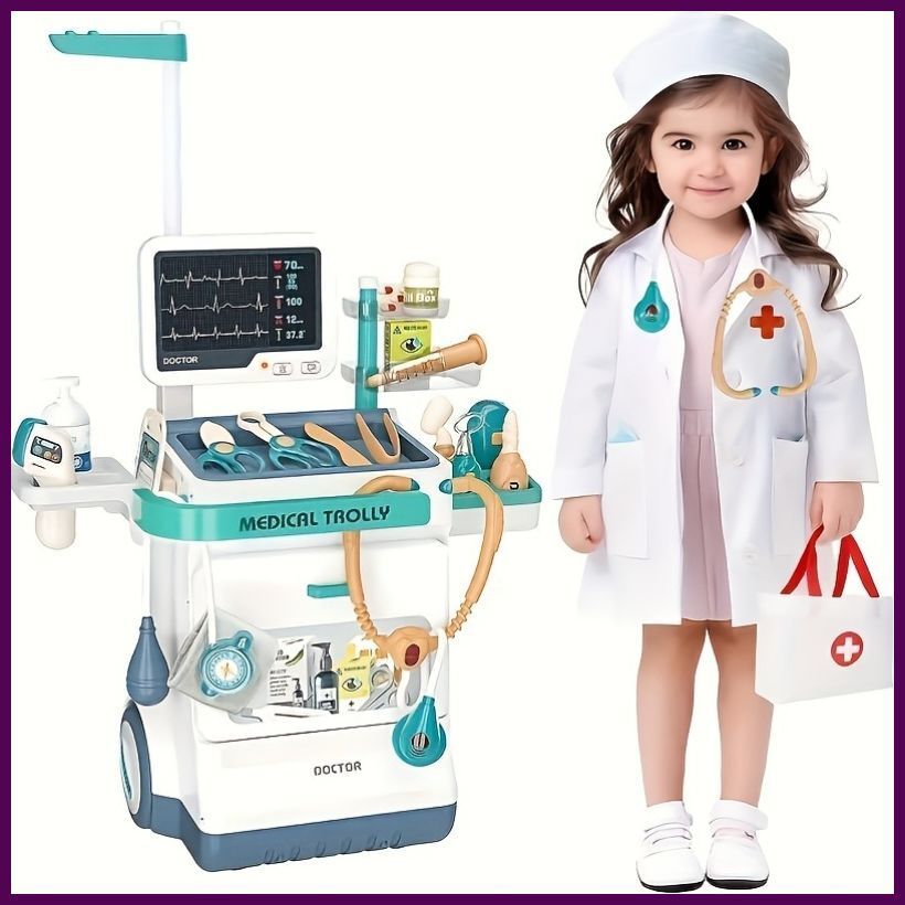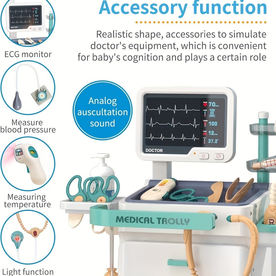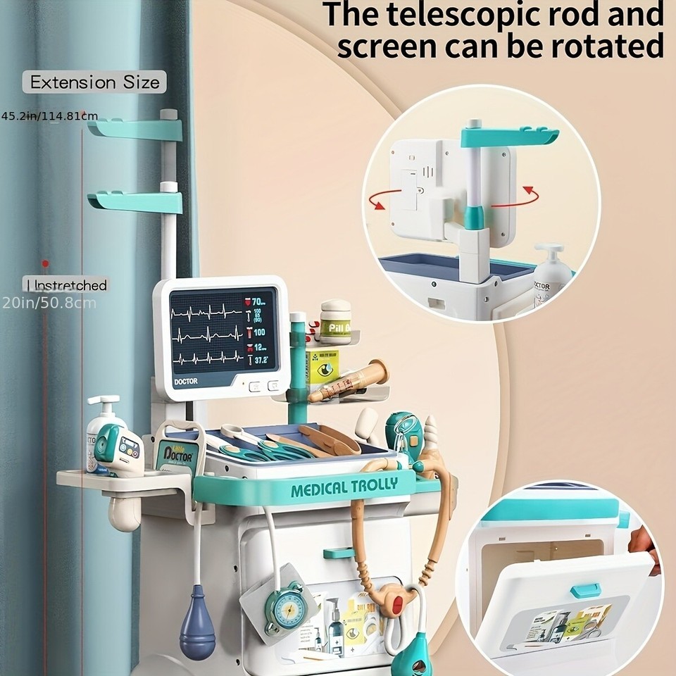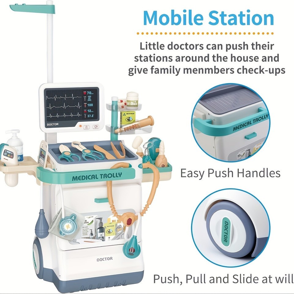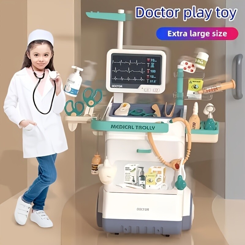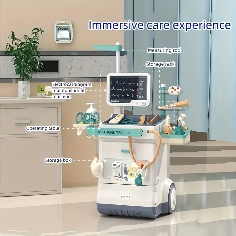 Includes a rolling trolley with built-in ECG machine display, medical drawers, and tool compartments?just like a real doctor?s station.