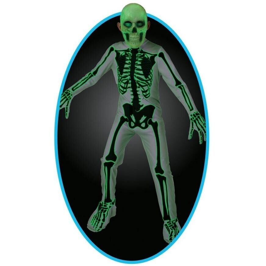 Kids can light up the night in this Glow-in-the-Dark Atomic Skeleton Costume! Perfect for a spooky and fun Halloween, this skeleton outfit includes a skull mask, bones jumpsuit, and matching gloves that give off an eerie green glow.