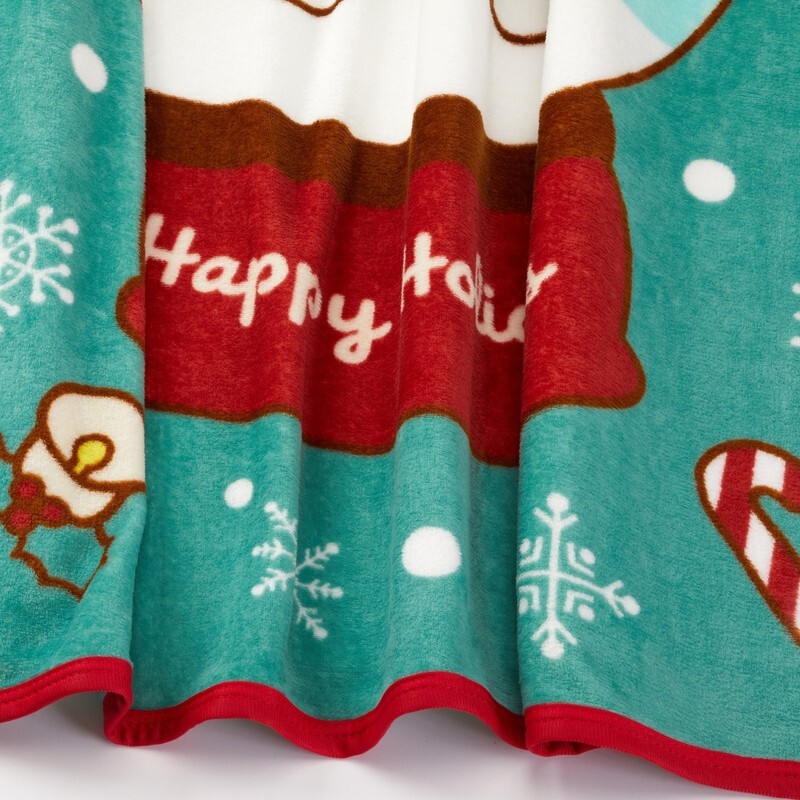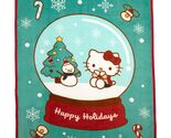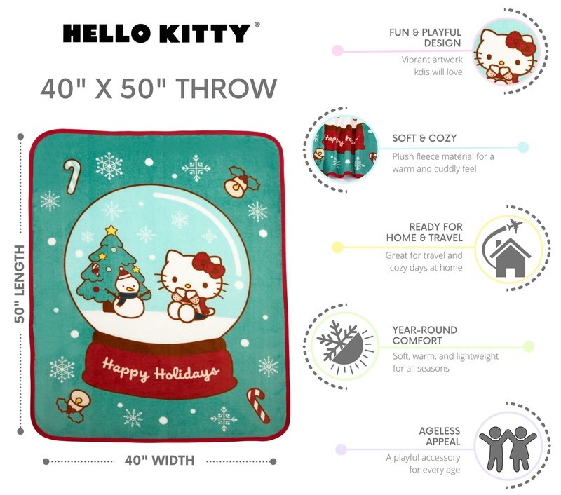 Celebrate the season in cozy style with this silky soft Hello Kitty holiday plush throw blanket. The festive design features Hello Kitty inside a cheerful snow globe surrounded by a Christmas tree, snowman, candy canes, and snowflakes on a wintry teal background. Measuring 40" x 50", it?s the perfect size for kids to snuggle up during holiday movies, bedtime stories, or chilly nights. Add a sweet touch of holiday cheer to your home with this adorable Hello Kitty holiday plush throw blanket.