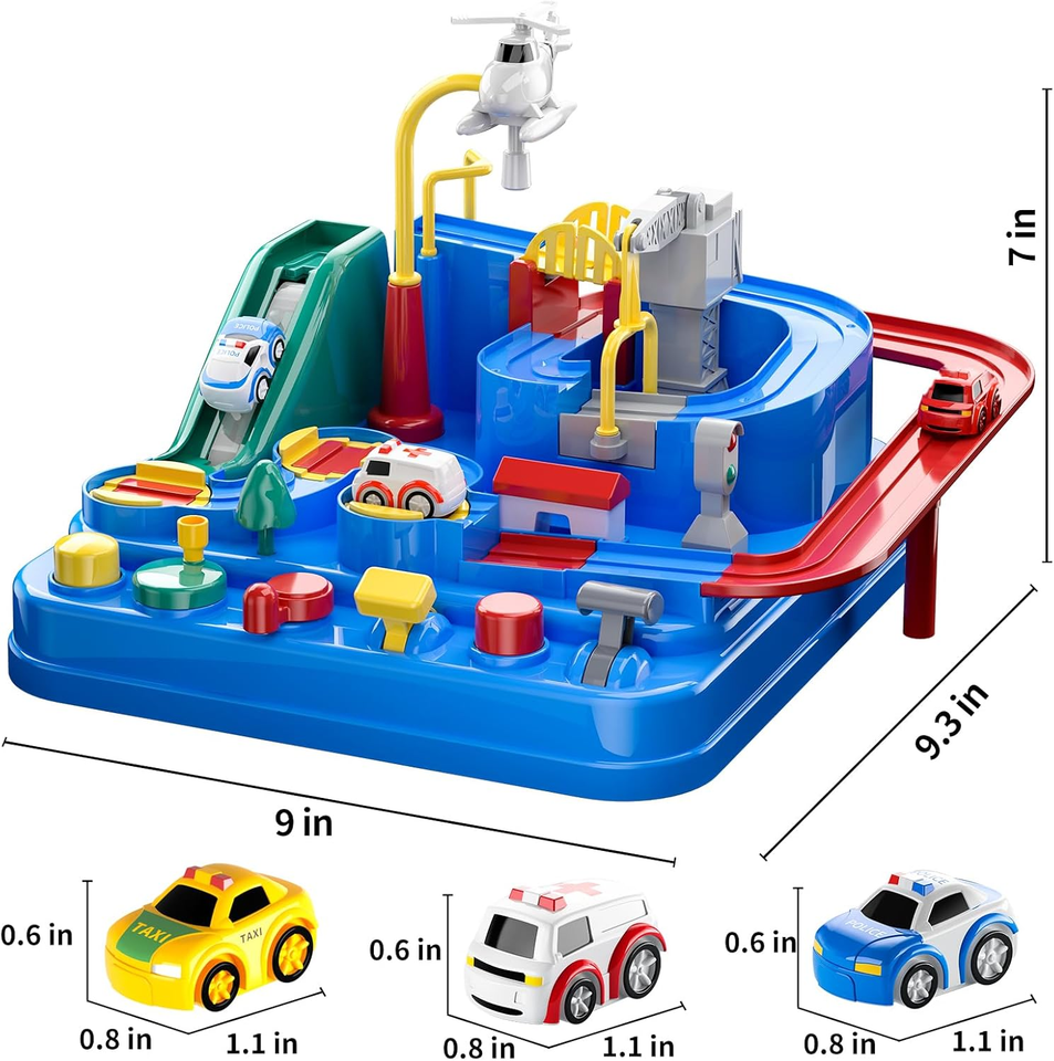 Children's Car Toy Set: This car adventurous toy has nice design, with 6 buttons and 8 different challenges, 3 little cars: police car, ambulance toy, red fire truck toy(or yellow taxi). Toy helps to improve kids' motor skills and hand-eye coordination