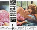 This six sheet has fold wear in the credits with separation and toning, wrinkling, light edge wear, and small light edge stains. The poster features a huge, gorgeous, brightly colored image of Novak.