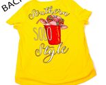 Good condition scooped neck bright yellow fun summer tee shirt. Bright graphics on the back "Southern Solo Cup" with white letters, a pink sun hat and a straw. The graphics are in excellent condition. No rips, stains or tears on the tee shirt only some minor pilling.