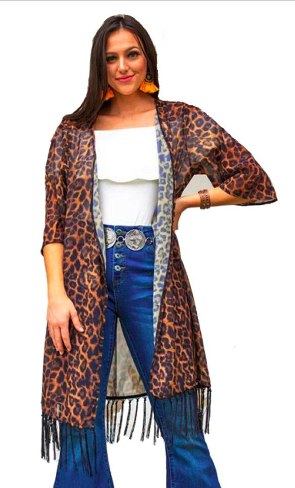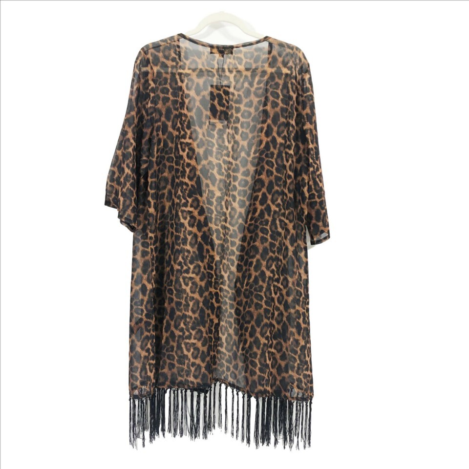 - Kimono Leopard with Black Fringe Sheer Mid Length Vest US Size Medium