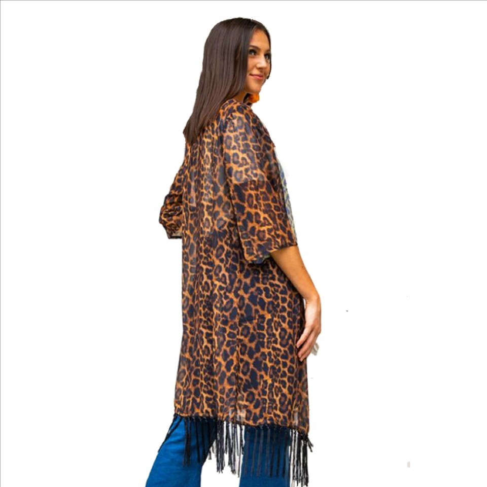 Kimono Leopard with Black Fringe Sheer Mid Length Vest US Size Medium