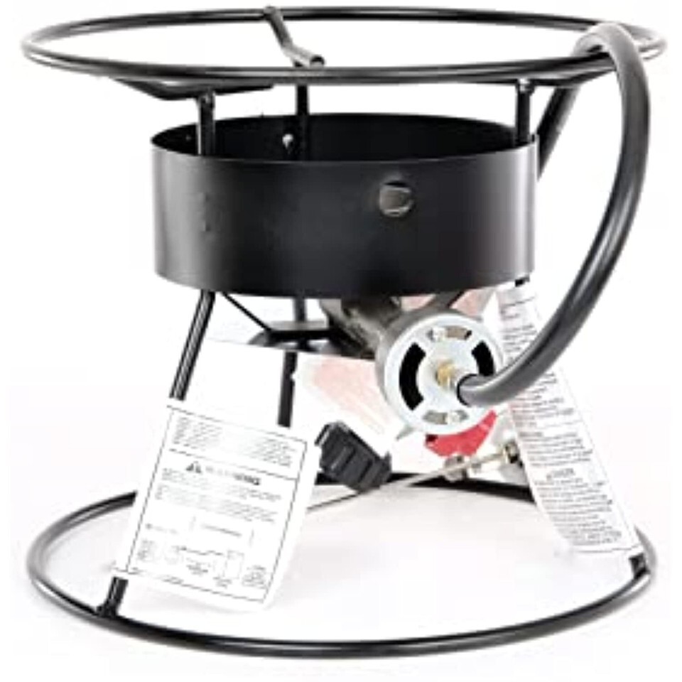 Metal Fusion Portable Propane Outdoor Cooker is made with a heavy duty design for durable, long lasting use and contains 54,000 BTU and a 12" tripod stand. Cooker is constructed with a recessed top ring and large bottom for added safety and optimal stability preventing unwanted spills. Features a flame protective wind guard, high BTU cast burner, UL listed LP hose and adjustable regulator with type 1 connection. Includes thermometer, instruction recipe booklet and a 4 color labeled box.
