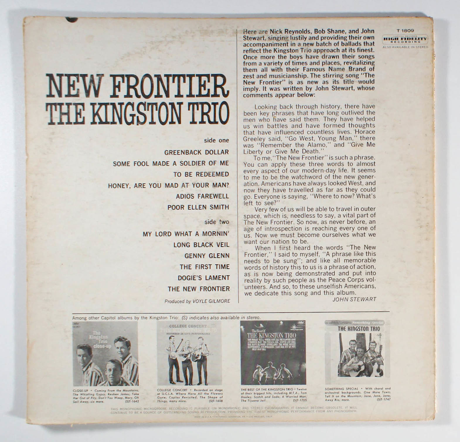 New Frontier, by Kingston Trio, reached No. 16 on the Billboard Pop Albums chart. The lead-off single was Greenback Dollar b/w New Frontier.