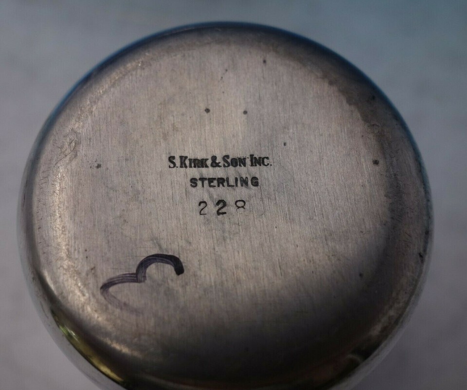 Wonderful Kirk sterling silver drinking cup marked #228. This piece measures 4 3/8" tall x 3" and weighs 6.4 troy ounces. It has an inscription on the front "Golf Tournament Mixed Foursome Won By" with "Field Day St. Thomas Parish Green Spring Valley Maryland 1933" on the reverse (see photos). It is in good vintage condition. Fantastic!