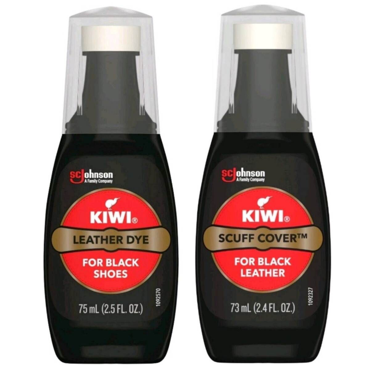 Keep your leather footwear and accessories looking sharp with the Kiwi Black Leather Care 2-Pack. This combo includes Kiwi Leather Dye (2.5 oz) and Kiwi Scuff Cover (2.4 oz) ? both with built-in applicators for quick, mess-free touch-ups. Perfect for restoring color, covering scuffs, and reviving tired leather shoes, boots, and accessories.