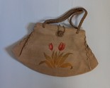 This Bohemian-inspired tan brown knit purse handbag with a floral print pattern and brown braided handles is a stylish and lightweight accessory for women. The medium-sized bag features a solid pattern, double handles. The knit exterior material gives it a comfortable and casual feel, perfect for a boho or hippie-themed look. With its unique design and accent floral print, this top handle bag is a versatile choice for everyday use. Normal wear. All sizes are approximate.