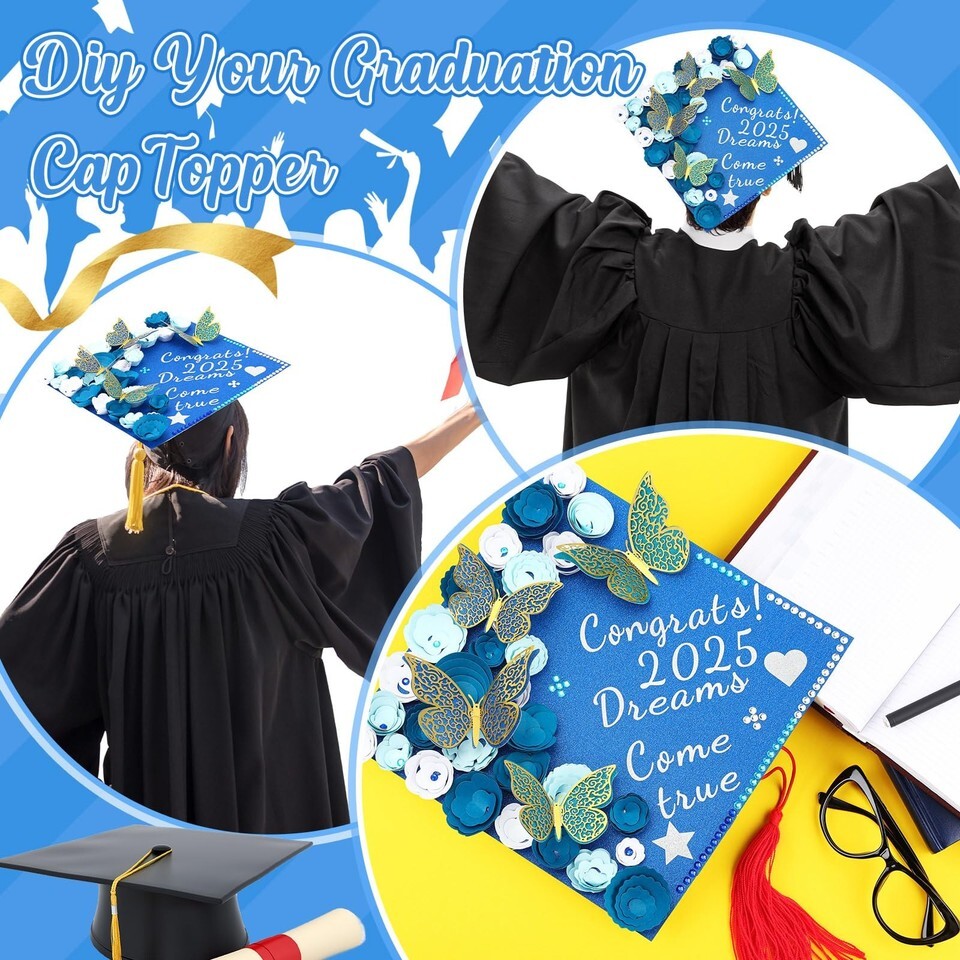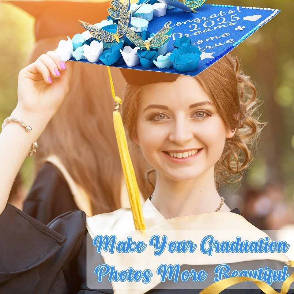 Complete Set for DIY Decoration: our kit comes with butterflies, diamond stickers, glitter alphabet letter stickers, and faux floral heads to encourage your creativity; Spell out your favorite mantra, or thank you words for memorable graduation quotations using the stickers, making your cap not just decorative but also meaningful on your graduation day