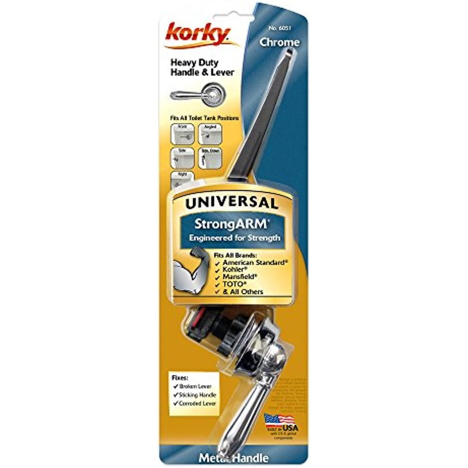 Product Description Korky Strong Tank Lever- 6051Bp From the Manufacturer Designed to fit the majority of toilets, the Korky StrongARM Handle Lever easily adjusts to fit all tank positions including: front, side, angle, right and down. Optimized for use with both 2? 3? flappers and canister-style flush valves, the engineer grade material in common stress areas performs as well as brass and aluminum levers. The StrongARM lever is adjustable to eliminate the need to bend for fitment and fits most popular brands, including American Standard, Kohler, TOTO others. The faucet style handle, in a chrome finish, is a great way to upgrade any toilet and compliment the bathroom?s decor. Easy to install, the 6051 includes: (1) Chrome Handle, (1) Tank Lever Arm, (2) Locking Clips and (1) Stainless Steel Lanyard Hook.