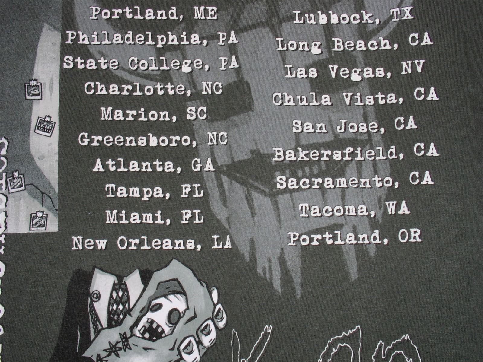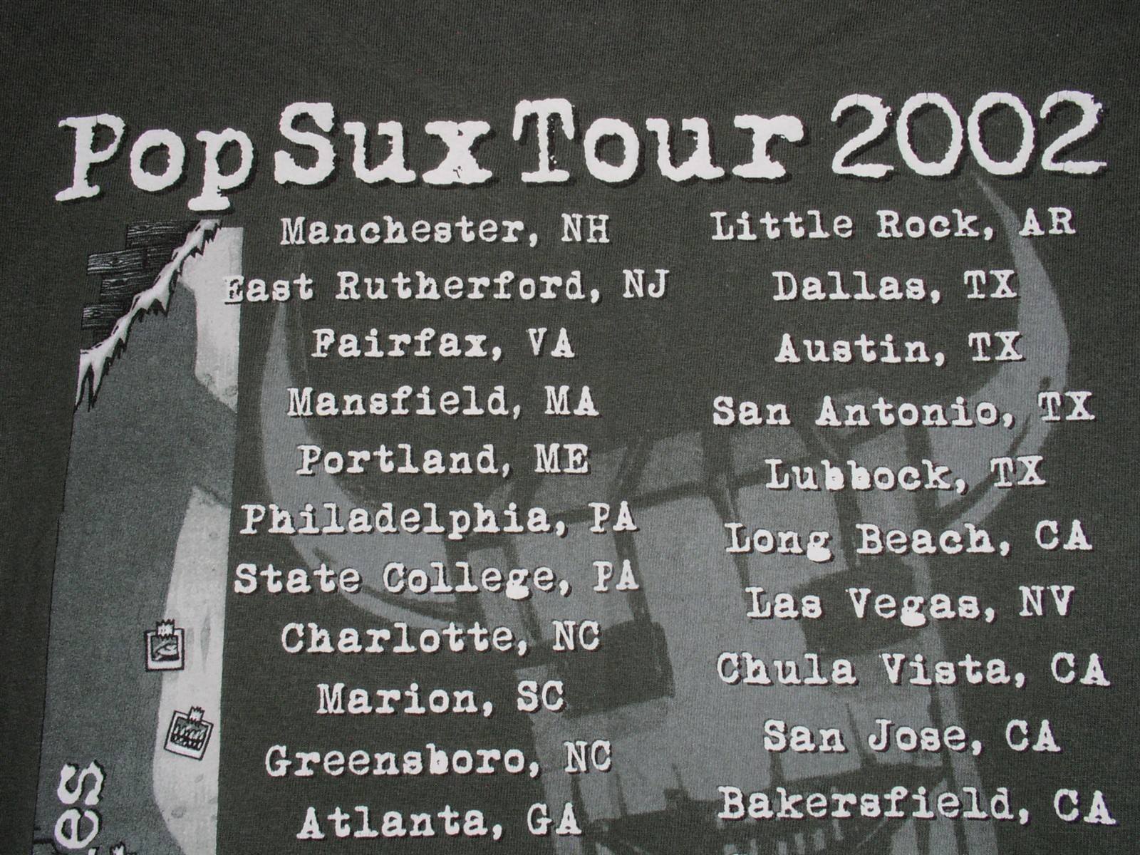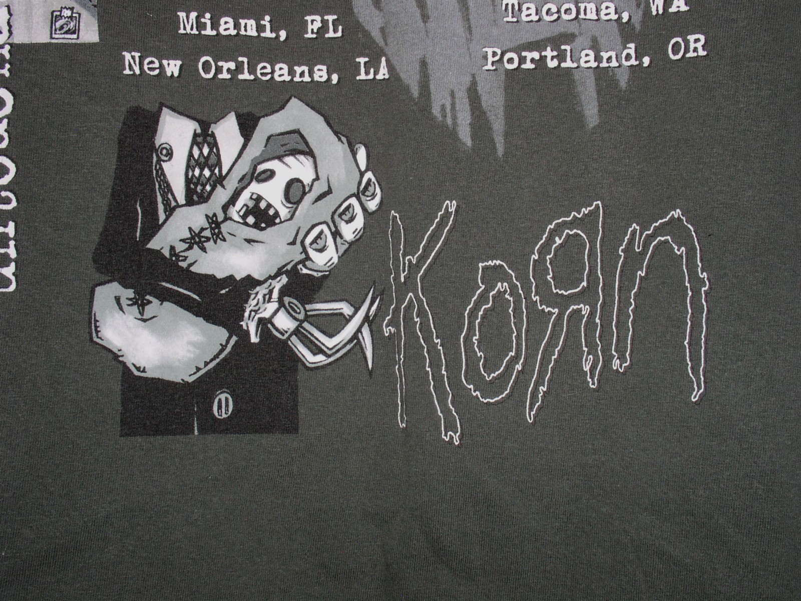 This is a vintage concert tour t shirt entitled, "Korn Untouchables Pop Sux Tour 2002". U.S.A. cities listed on the back makes this all the nicer. Bottom print is illegible due to the dark print on the dark fabric. I think it reads: 2002 Korn under license to Giant but uncertain. Tag reads: AAA Alstyle Apparel Activewear. A terrific item for the fan or collector.