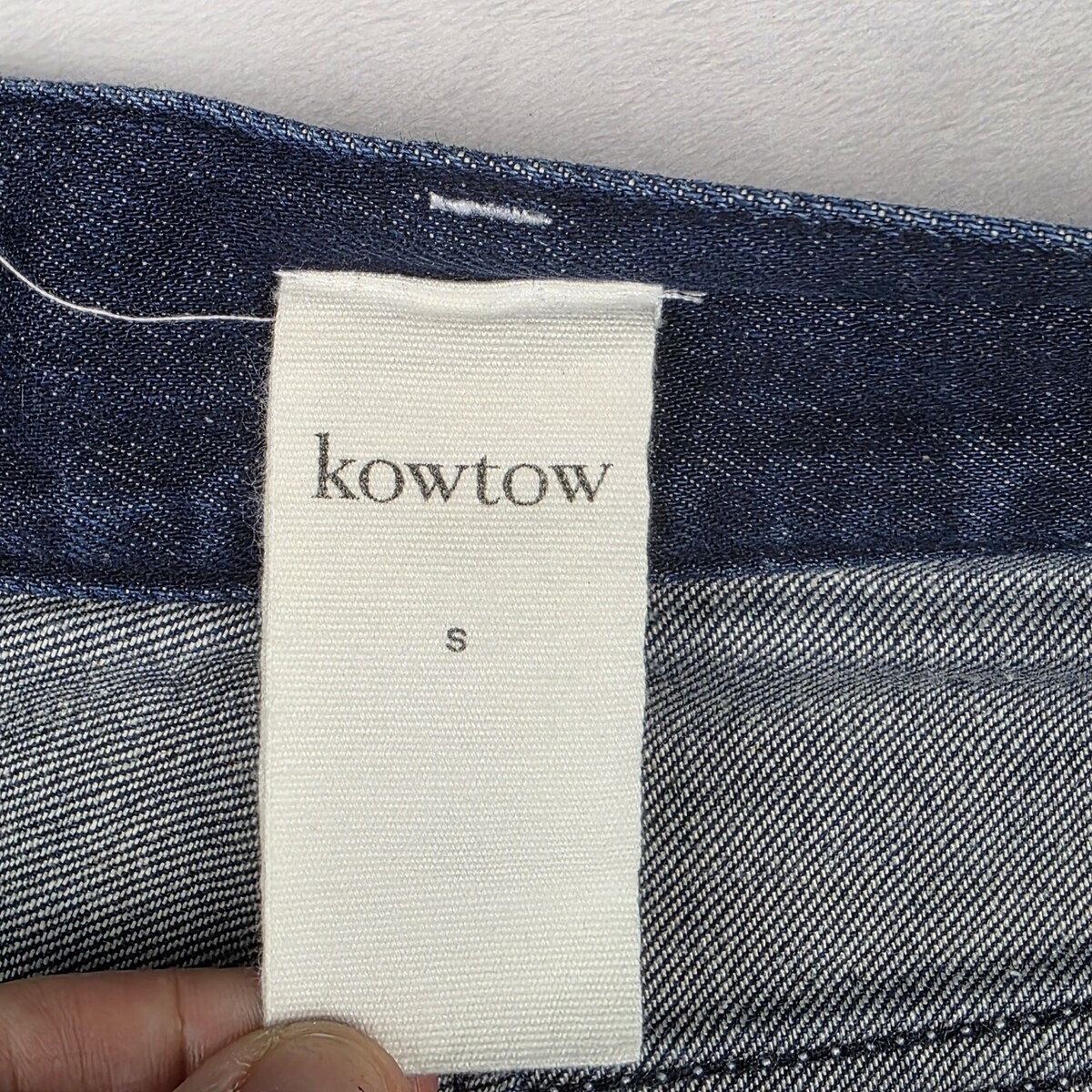 The Kowtow Jeans in women's size small feature a wide-leg style in a dark wash blue denim. Made from 100% cotton, these pants have a button closure and a high rise. The design includes accents like buttons and a logo, and they have a 5-pocket design with an inseam of 28 inches. Perfect for any season, these jeans offer comfort and easy care, making them a versatile addition to any wardrobe. The brand's focus on sustainability and ethical practices adds a unique touch to these stylish and trendy pants.