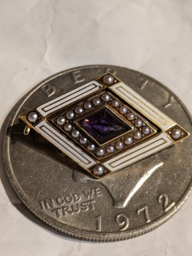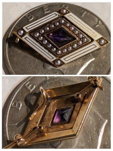- Krementz 14k Gold Amethyst Pearl White Enamel Pendant Brooch Diamond Shaped
