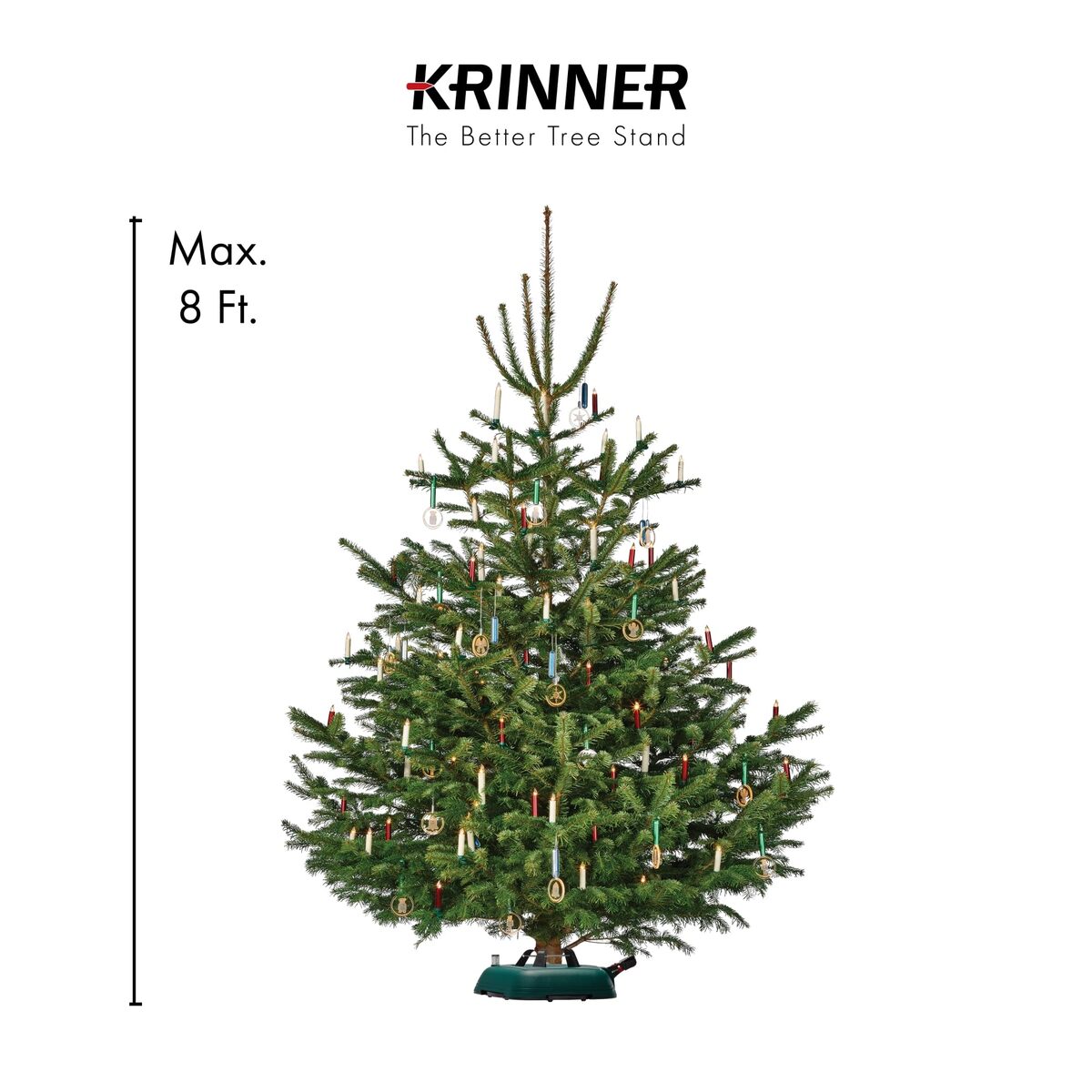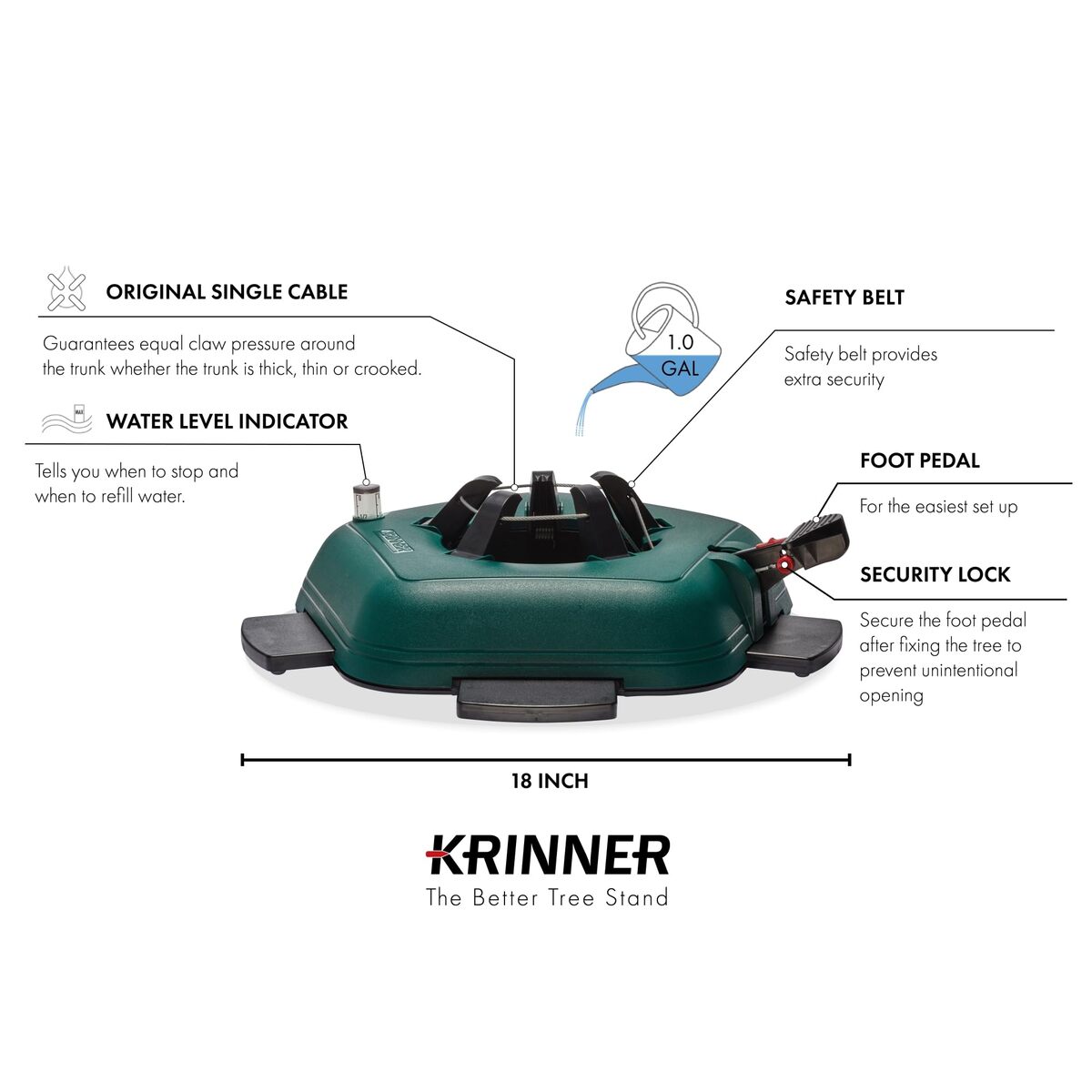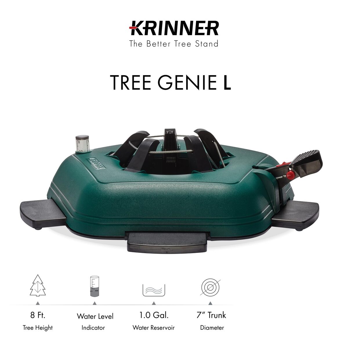 Product description: Enjoy a hassle-free holiday season with the Original German-made KRINNER Tree Genie Large Christmas Tree Stand, designed for live trees up to 8 feet tall. Klaus Krinner?s patented single-cable system applies even pressure for a secure and upright hold. The foot pedal setup allows for quick installation without the need for screws or extra hands. Keep your tree fresh throughout the season with the built-in 1-gallon water reservoir and level indicator, ensuring your tree stays hydrated. The durable design and step-by-step ratchet locking system provide maximum stability, giving you peace of mind. To ensure your tree stays upright, there are 5 stabilizer feet for additional security. No assembly required - just set up, secure, and enjoy a beautifully displayed Christmas tree!