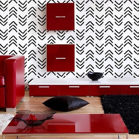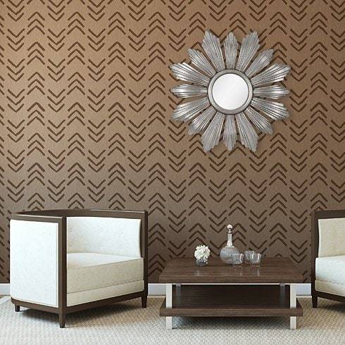 Check out this Kuba Chevron Allover stencil design! This trendy new design combines both tribal and geometric influences. Use this wall stencil to make your own accent or feature wall, or even transform the look of an entire room! Anyone can achieve fantastic results without the hassle or cost of wallpaper! DIY decorators can also use this stencil for rugs and floors or to create one-of-a-kind designer curtains.