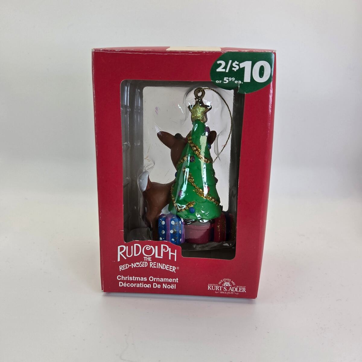 This Rudolph the Red-Nosed Reindeer ornament by Kurt Adler is a charming holiday collectible. It features Rudolph standing beside a decorated Christmas tree with presents. The ornament comes in its original box, which shows wear and separation, but the ornament itself appears unused. A festive addition to any Christmas tree or Rudolph collection.