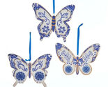 KURT ADLER SET OF 3 PORCELAIN INDIGO BLUE- DELFT STYLE BUTTERFLY ORNAMENTS J7462