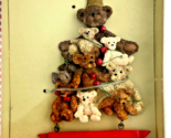 A pile of bears stacked up to make a tree shape. Can be personalized on the banner. There is a gold star on top.