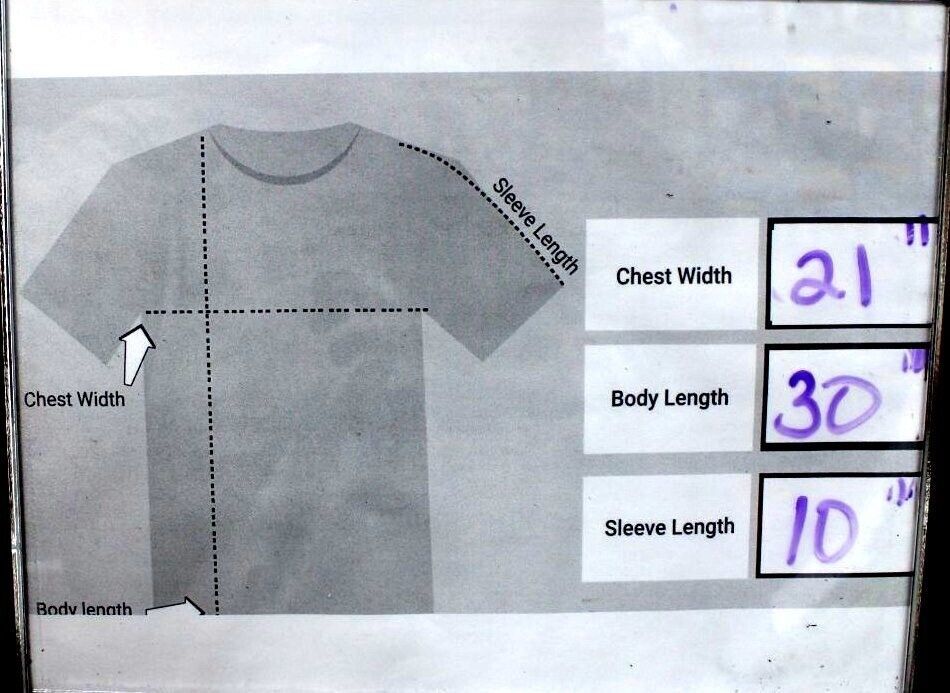 Chest Width = 21 Inches, Body Length = 30 Inches, Sleeve Length = 10 Inches