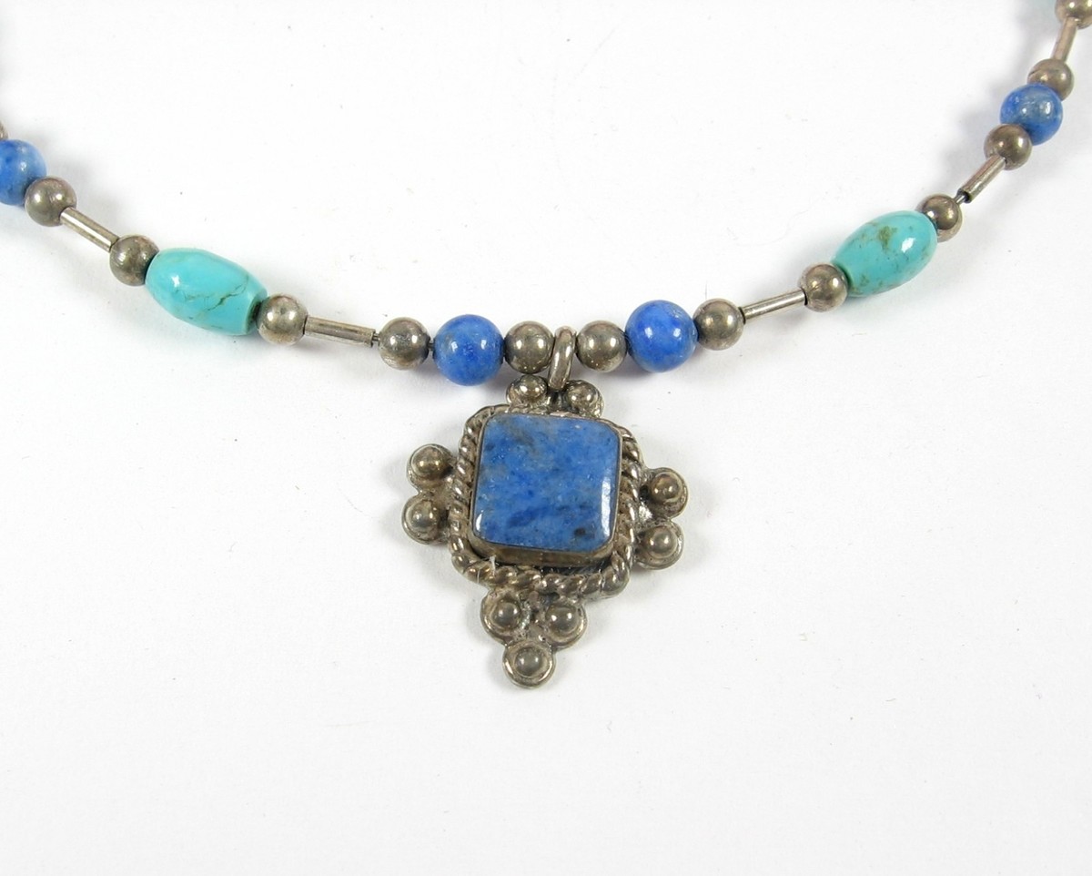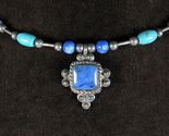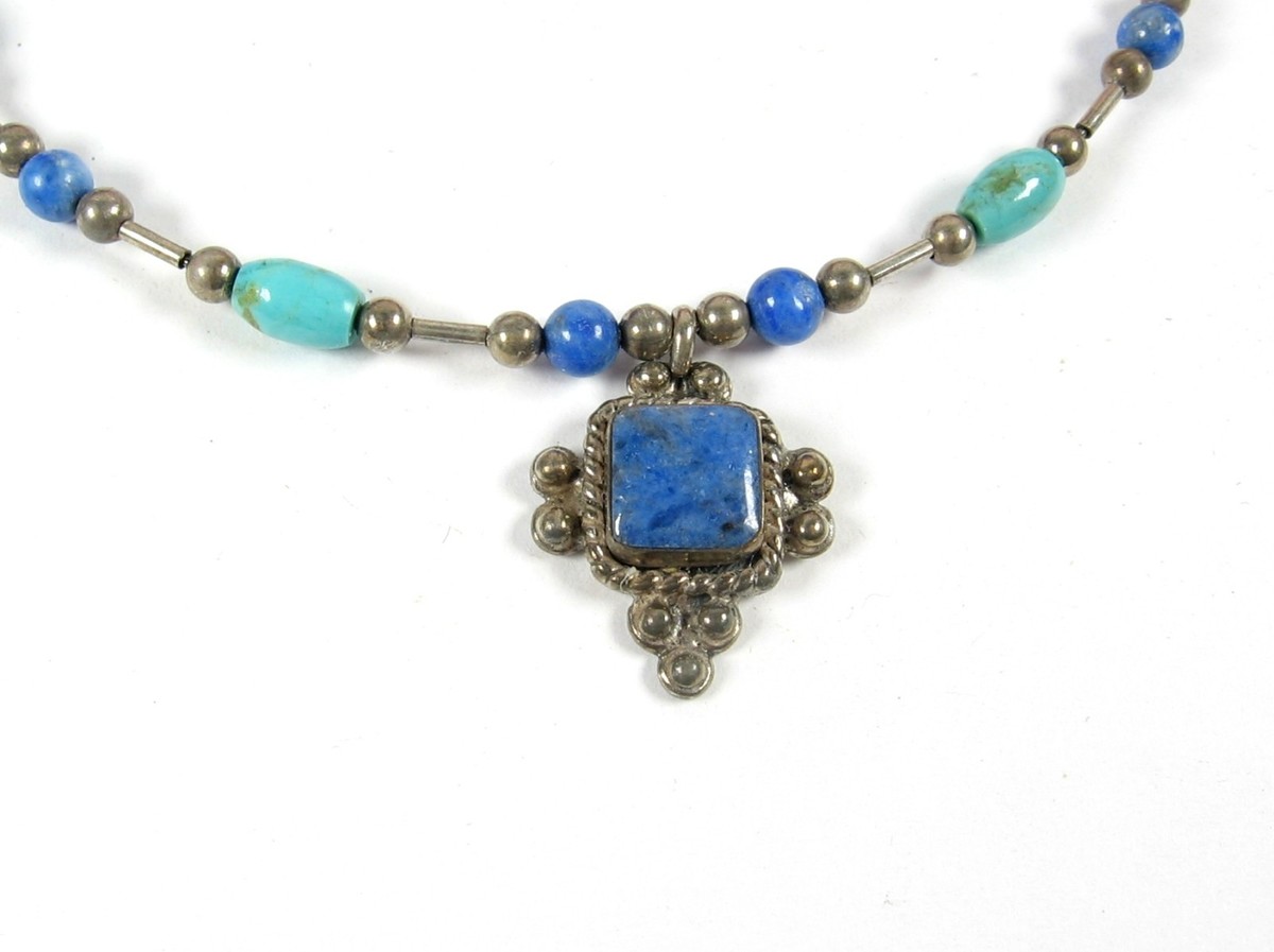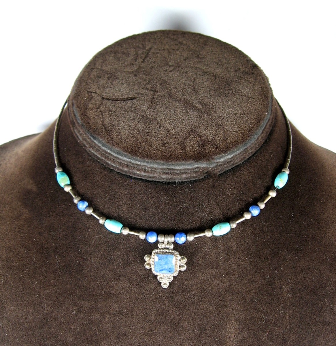 - LAPIS LAZULI & Turquoise Beads STERLING SILVER NECKLACE Choker Ring 925 BTO Sign