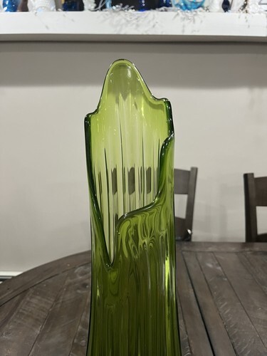 This is a vintage, hand-blown glass vase produced by L.E. Smith in the 1960s. The vase is 19.75 inches tall and 6.25 inches wide, with a ribbed pattern and a fat bottom. It is made of green stretch glass and has a high gloss, textured finish. The vase is a decorative piece with an art theme and MCM style, and it is an original production.