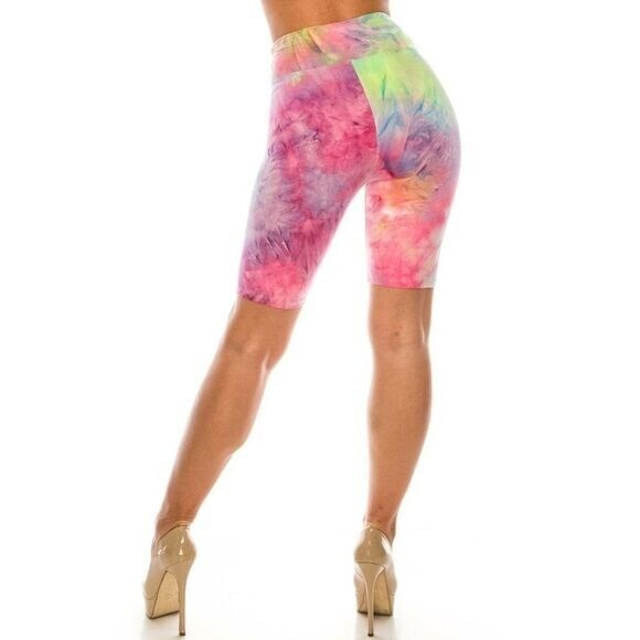 - L/XL Tie Dye High Waisted Biker Shorts - 3 Inch Waist Pink/Yellow