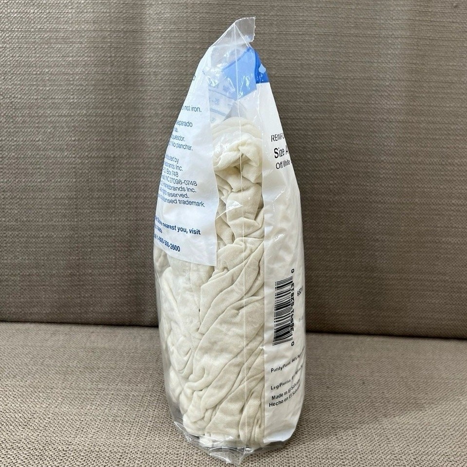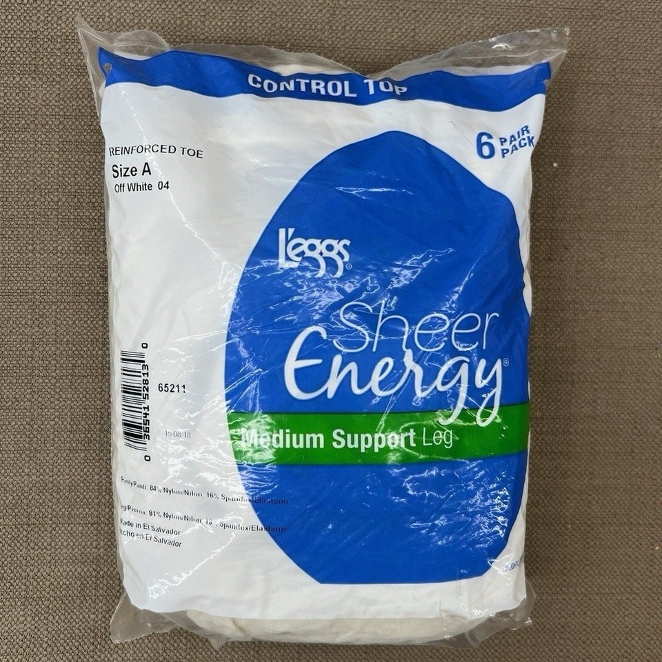 This listing includes a sealed 6-pack of L?eggs Sheer Energy pantyhose in Size A, color Off White. Features include control top, reinforced toe, and medium support. The packaging notes ?slightly imperfect? and packaging shows light wear, but contents remain sealed and unused.
