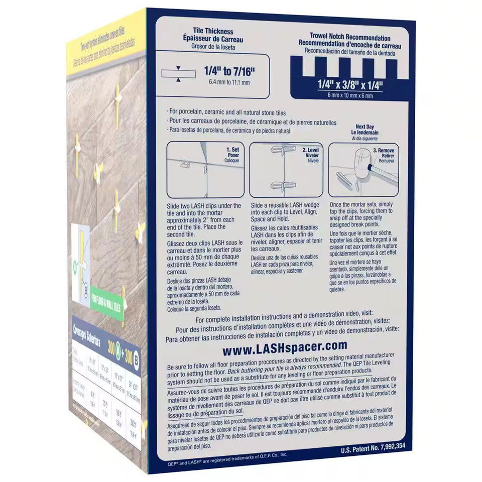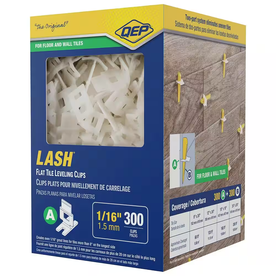 Install tile with professional results while saving time with QEP LASH Tile Leveling Clips. Level, Align, Space and Hold tile in place to prevent lippage, ensure a consistent finish and correct tile bowing. The Clips, Part A of a 2-part system, produce even grout lines and raise neighboring tile of the same thickness for a level finish. The Wedges, Part B, hold the tile at an even height for lippage-free results (sold separately). The QEP LASH Clip and Wedge Tile Leveling System is used by professional and DIY installers alike to save time while providing a level and consistently spaced tile wall or floor. For quick and easy removal, the single-use Clips are designed to break off below the surface of the tile with a kick or strike of a floor mallet, while Wedges can be saved and reused.