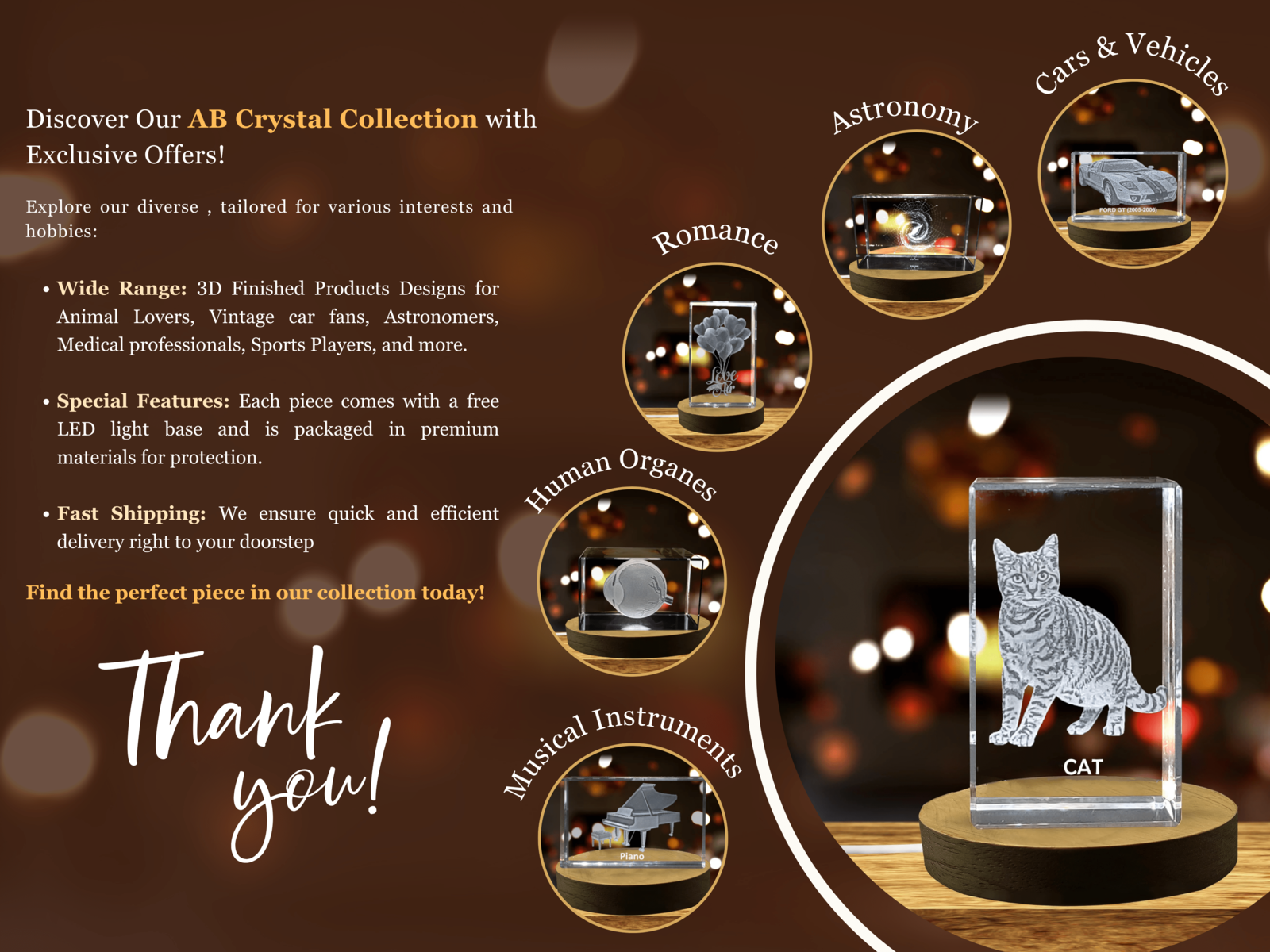 First, our designers create a unique and detailed 3D model. Then, our skilled technicians etch the 3D model into crystal using advanced laser technology.