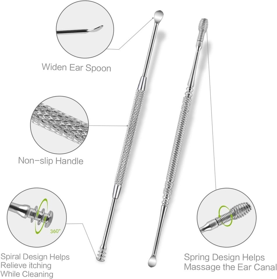 Double Head Ear Pick: Features two double-ended anti-slip earpicks with a unique spring and spiral design to relieve itching and massage the ear canal, allowing for gentle, thorough cleaning.