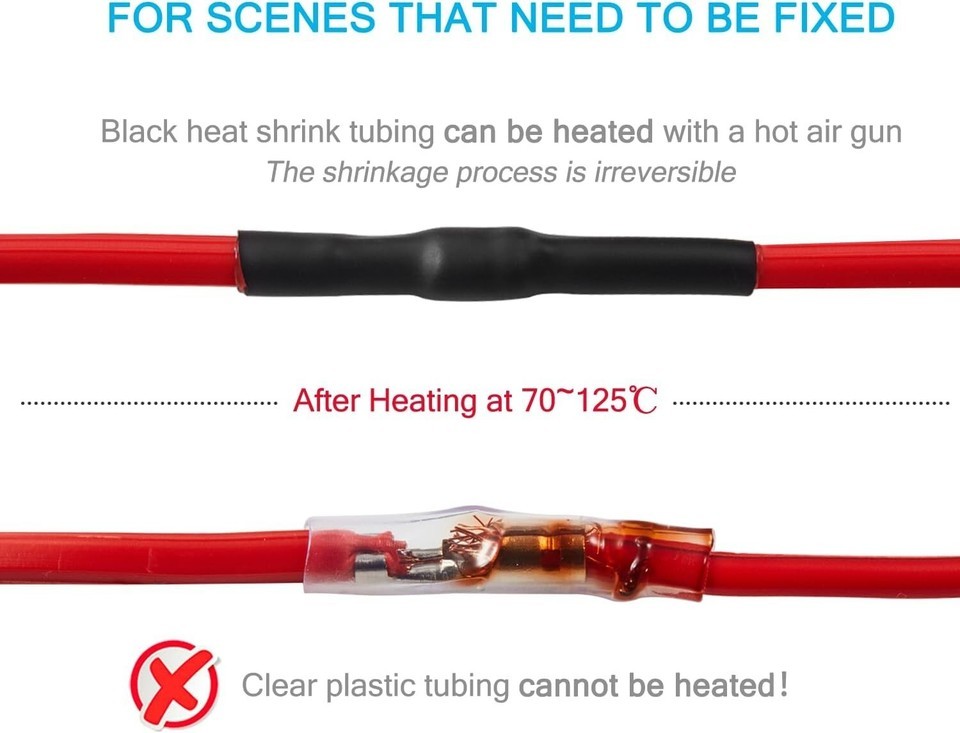 Black 3:1 Ratio Heat Shrink Tubing Included: Perfect for creating stable connections; simply use a hot air gun to shrink the tubing between 70-125?. (Note: Clear plastic tubing is not heat shrink and cannot be used for this purpose.)