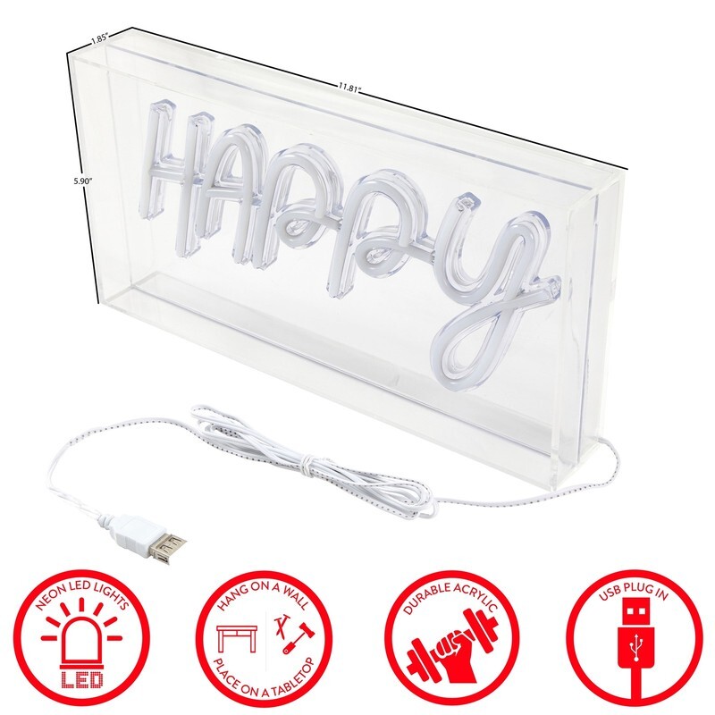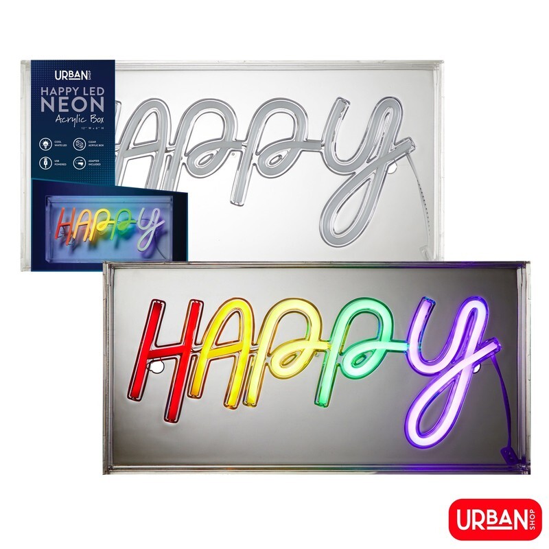 Urban Shop LED Neon Happy Light-up Clear Acrylic Box, Rainbow Part of our collaboration with the Urban Shop Novelty Lighting Collection Measures: 11.81 x 1.85 x 5.90 inches Can be hung up on a wall or placed on a desk, table or shelf. Wipe clean for easy care and maintenance Features energy efficient LED bulb Includes a plug in USB adaptor for easy use Urban Shop LED Neon Light-up Acrylic Box is available in a variety of styles such as Smiley Face, Dream Big, Hustle, Cheers, Happy, and XOXO Perfect for any room of your home!