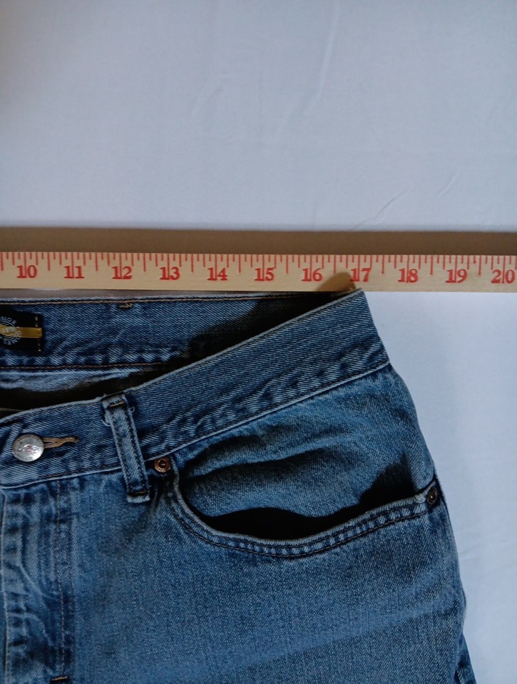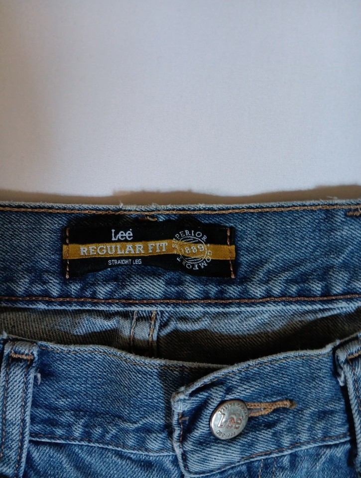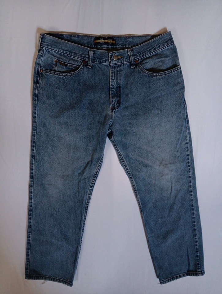 The product is a pair of men's LEE jeans in a distressed blue color, size W36 X L29 with a regular fit. Made of 100% cotton denim fabric, the jeans feature a zip closure and mid-rise. They are part of the Lee product line and are designed for easy care. The American-themed jeans have a vintage style and are perfect for everyday wear. Normal wear work jeans.