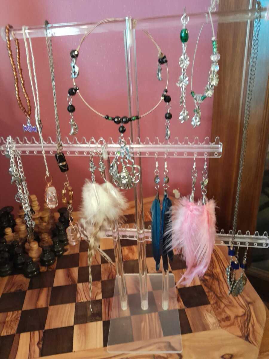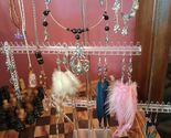 This fun lot has a lot of odds and ends. Like: Feather Earrings, Crystal Car Rearview Dangles, Necklace Earrings Set, Bracelet, Bookmark, Guitar String Candle Rings, Guitar Ring bracelet and more!