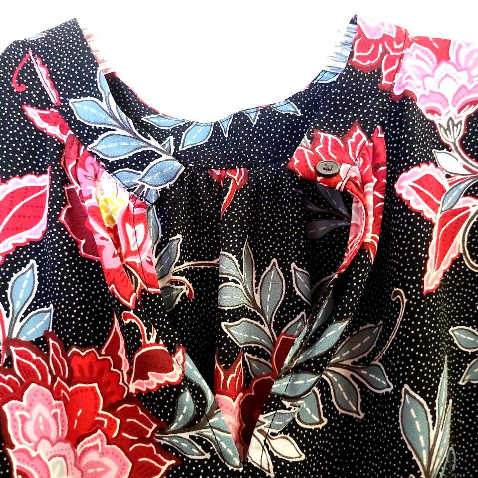 Style: Blouse, Floral Garden, Bell Sleeve, Mock Neck, Ladder Shoulder Trim, Back Keyhole, Chiffon, Retro, Career