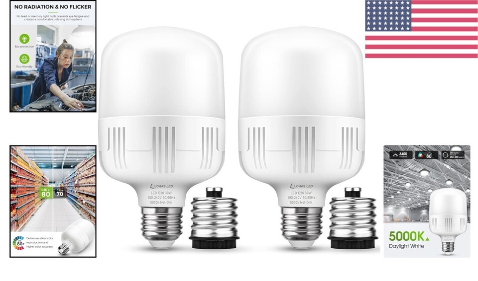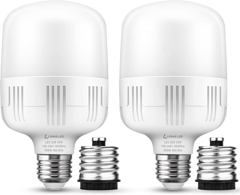 - LOHAS 30W LED Garage Bulbs - 3500lm Daylight 5000K, E26/E39 Adapter, 2 Pack