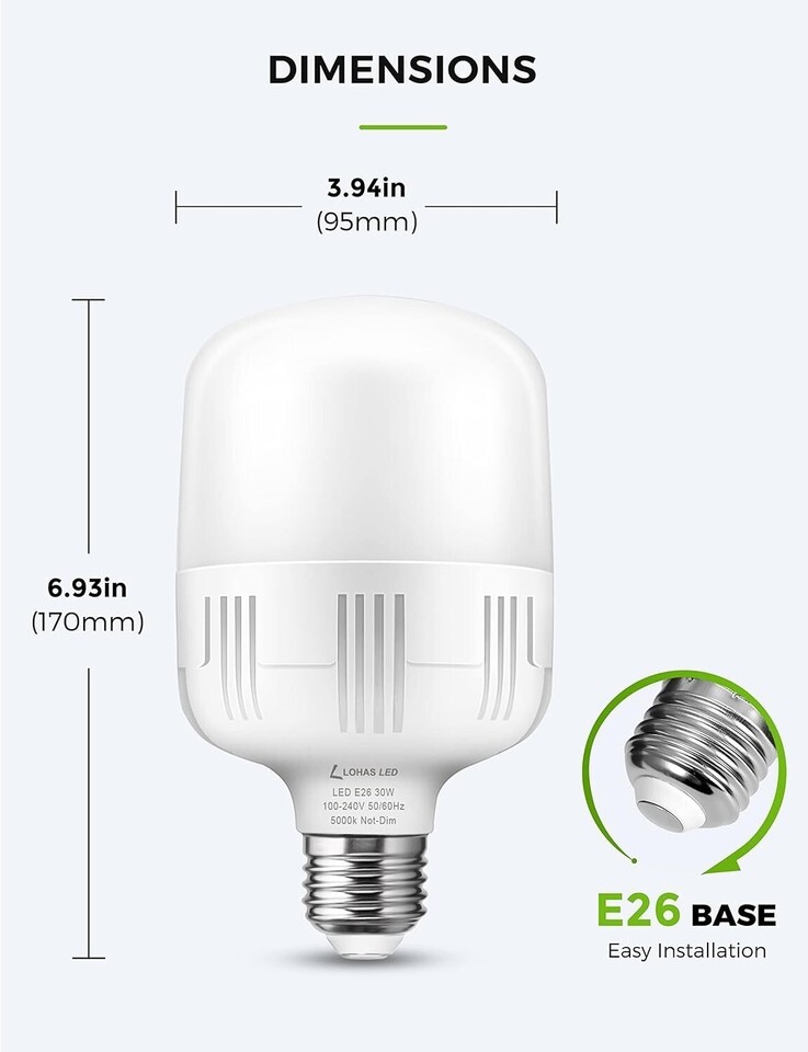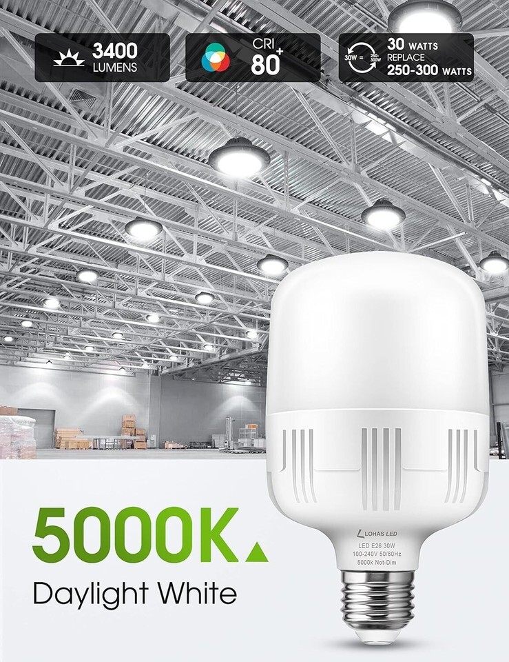 Transform your lighting experience with LOHAS 30W LED Garage Bulbs. Say goodbye to the hassle of frequent replacements and high electricity bills. Offering remarkable efficiency and brilliance, these bulbs are designed to light up your space beautifully without the frustration of flicker or noise. Whether in your garage, warehouse, or gym, these bulbs make your environment brighter, safer, and more efficient.
